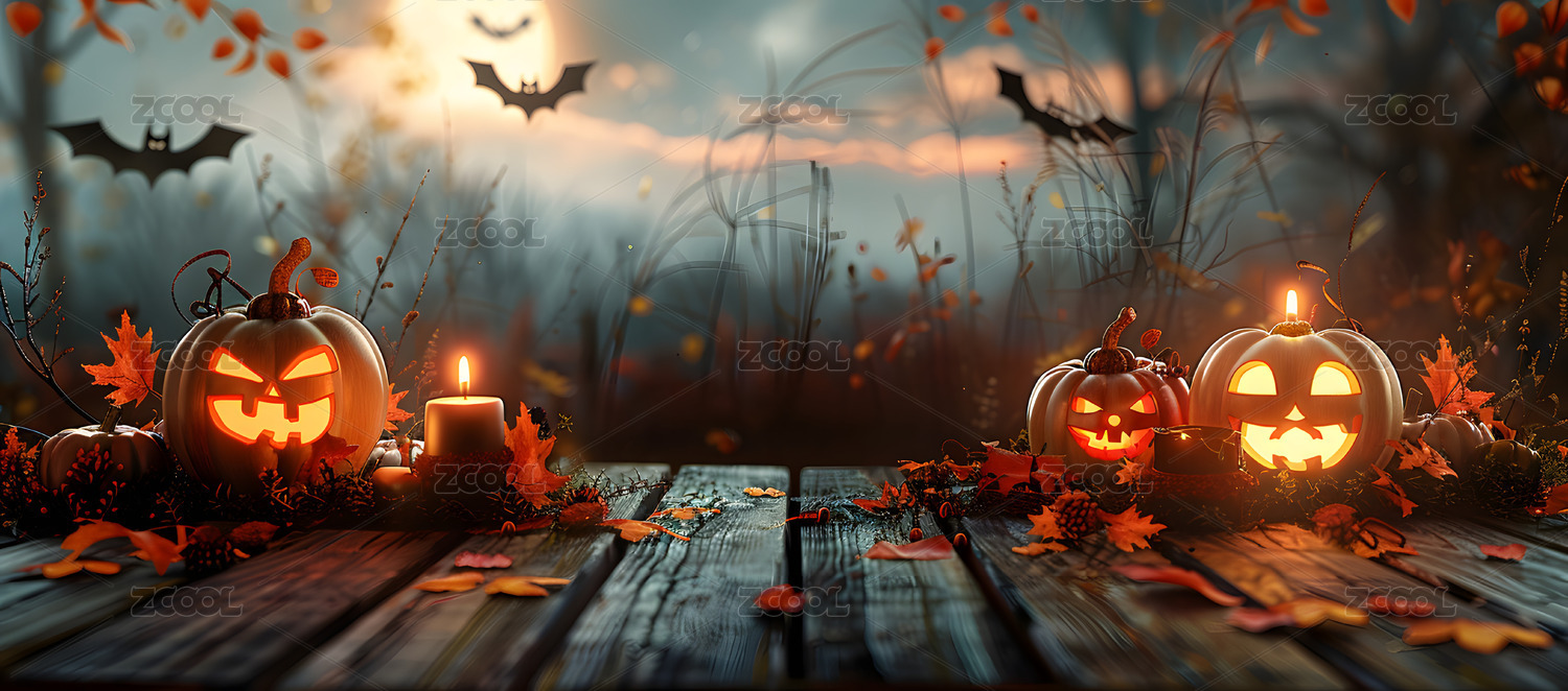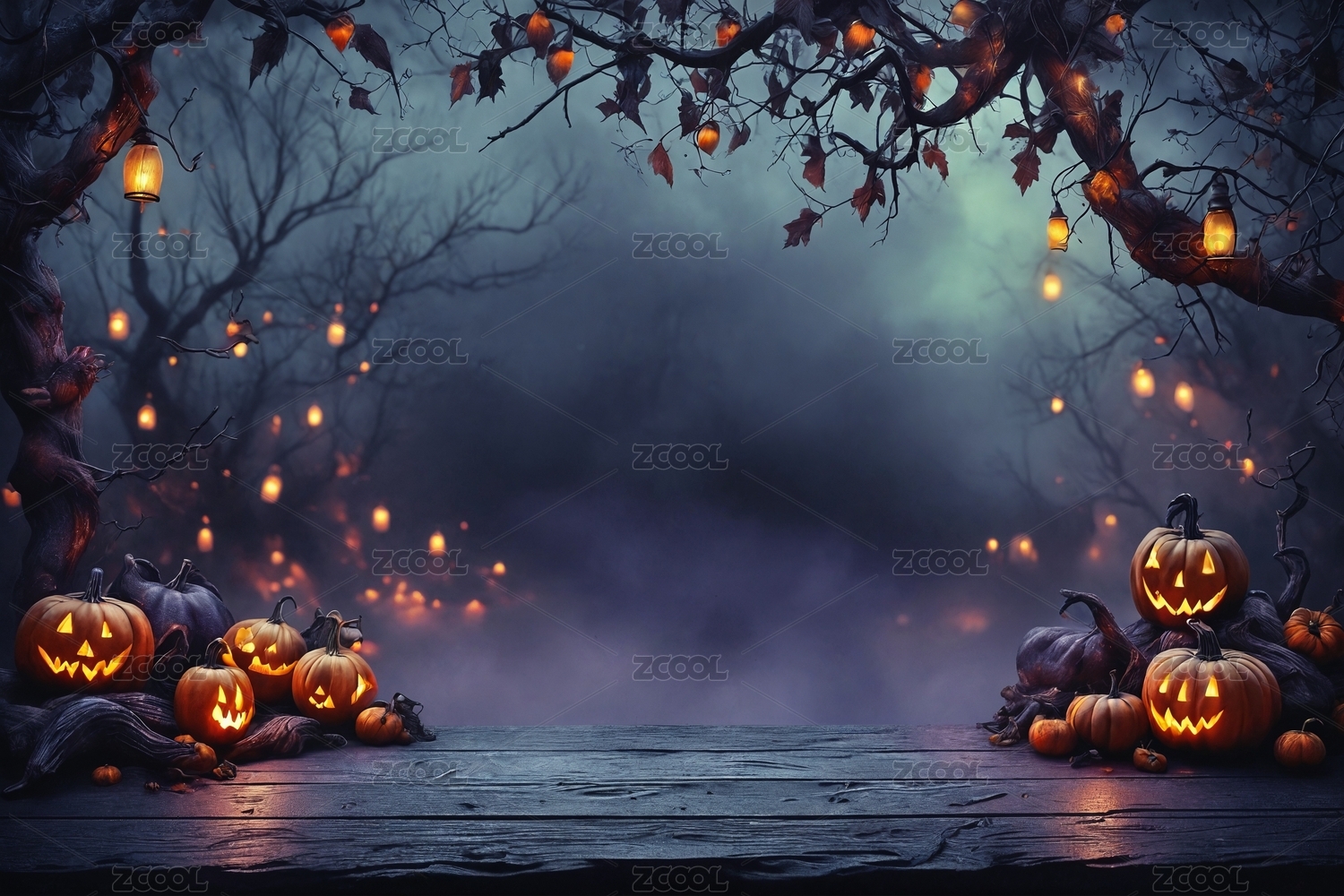 万圣节之夜,在幽灵森林的木桌上放着南瓜