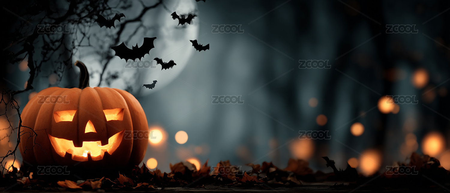 深蓝色万圣节背景,阴森的树林与南瓜灯