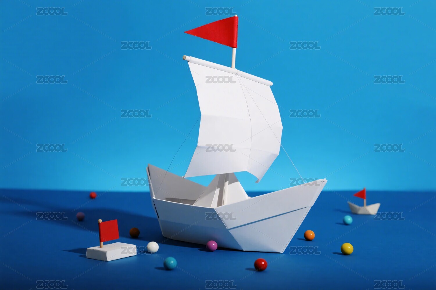 蓝色背景下的折纸帆船画面