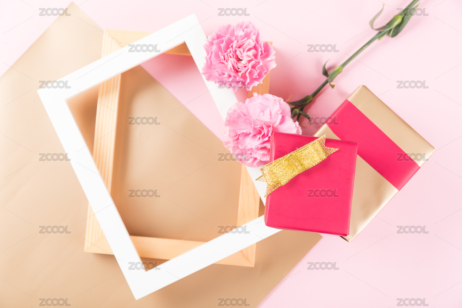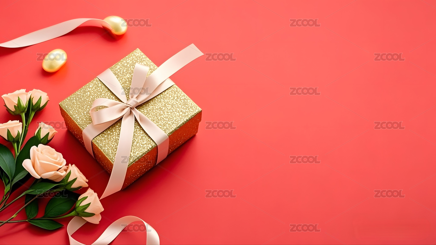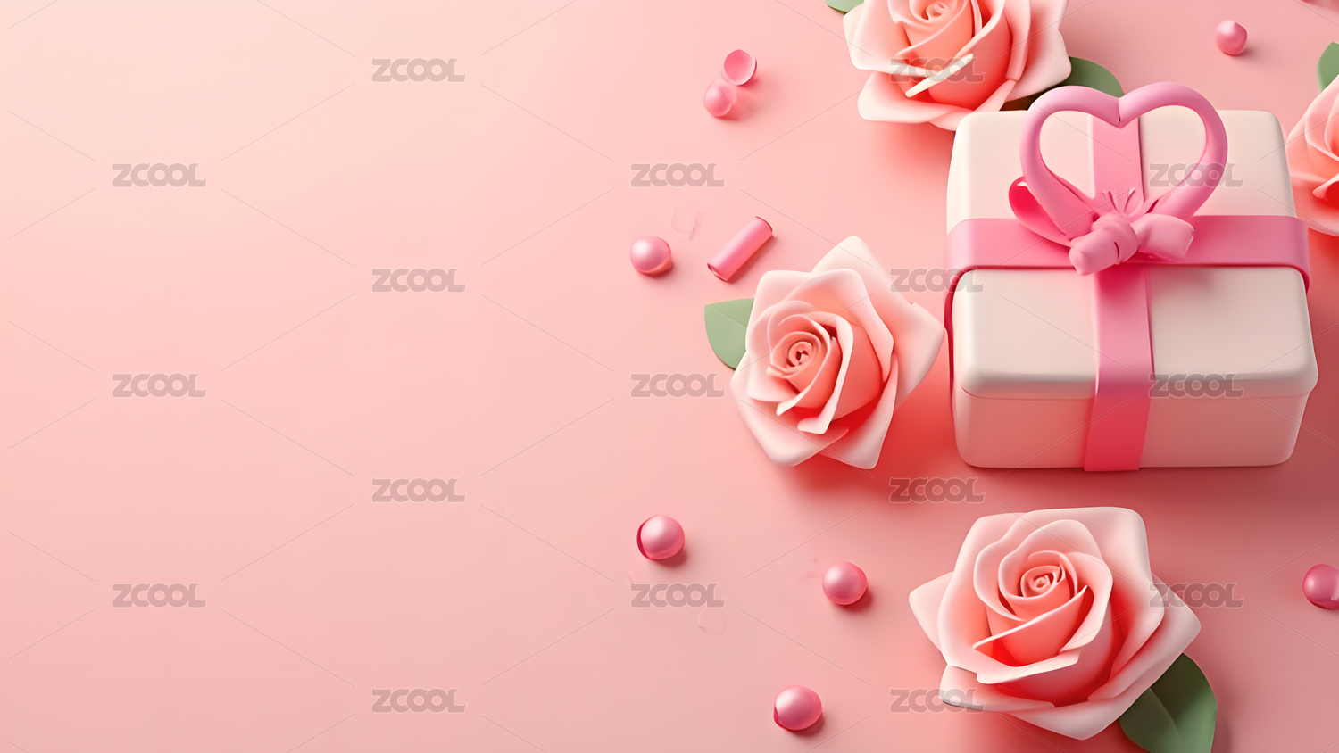 放在淡粉色背景上的玫瑰鲜花和礼物