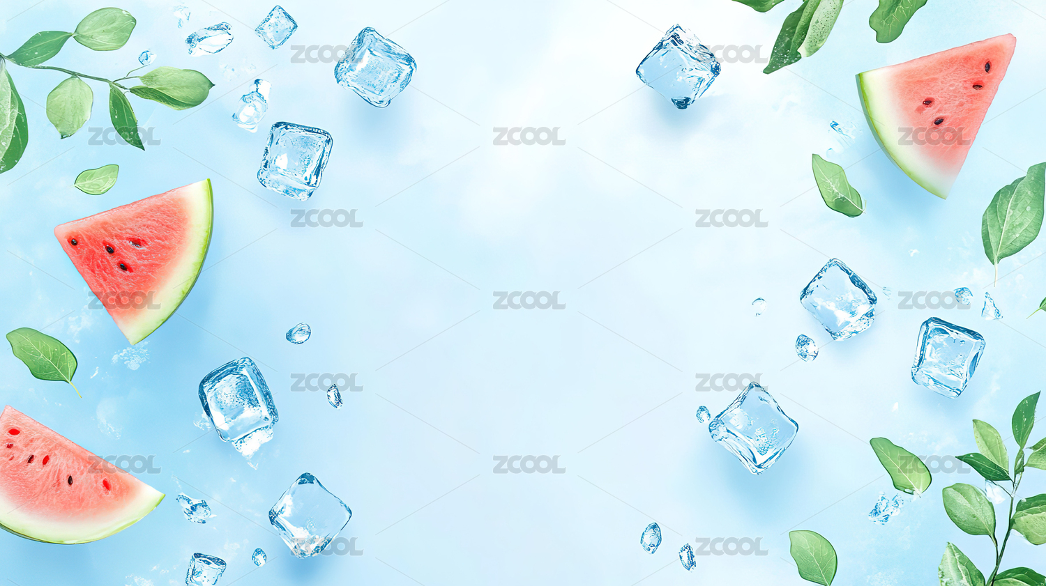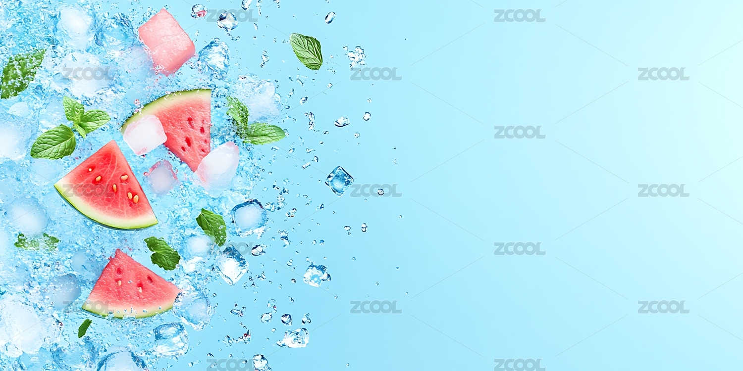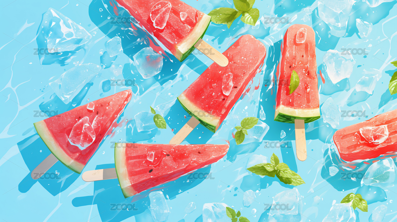 橙色的冰棒和西瓜片在浅蓝色的冰水中