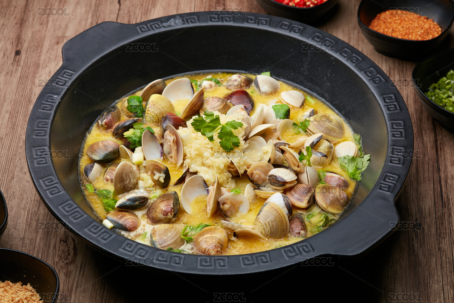 黑色餐布上的一口铜锅火腿炖柴鸡