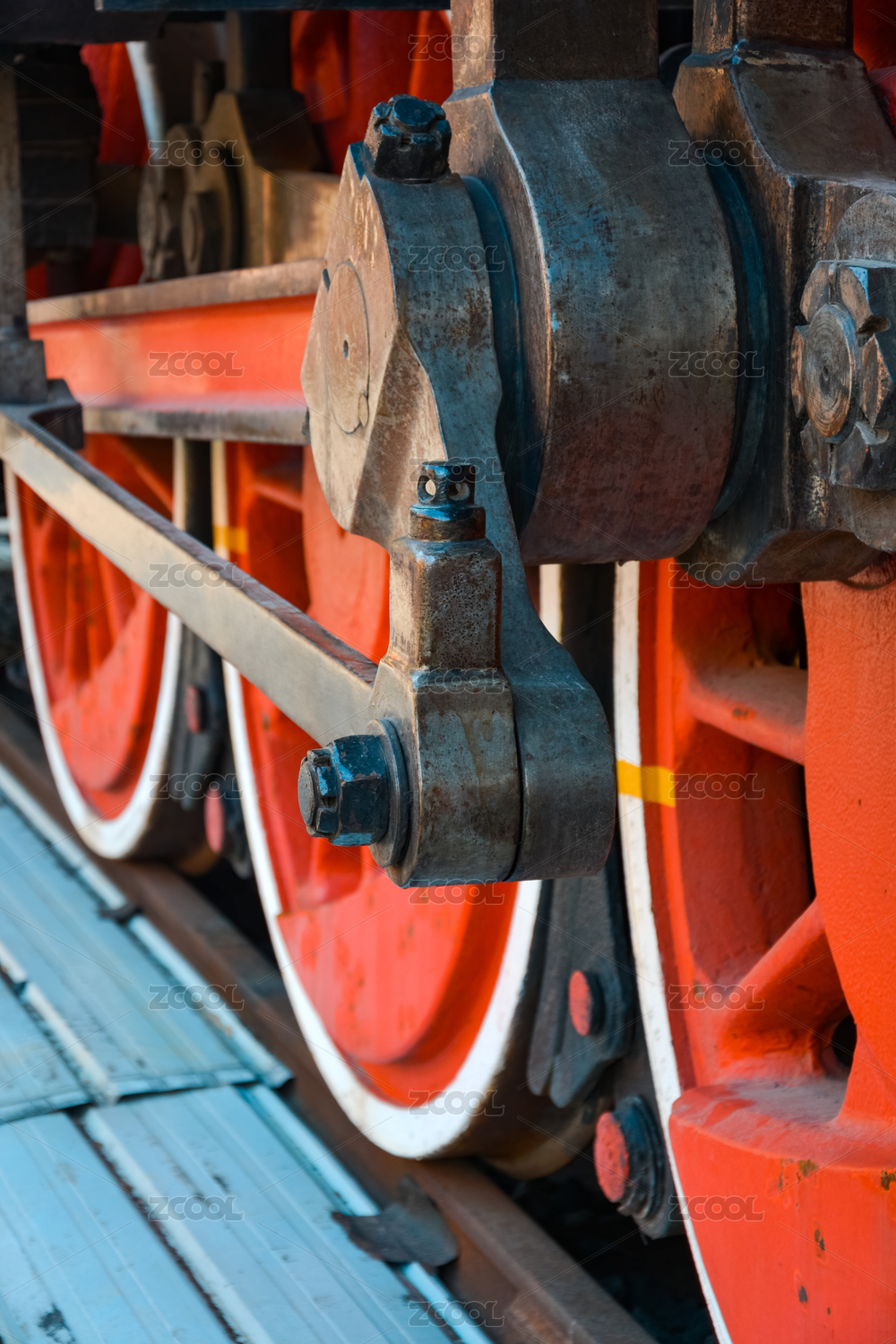 户外红黑涂装的老式蒸汽火车的驱动轮