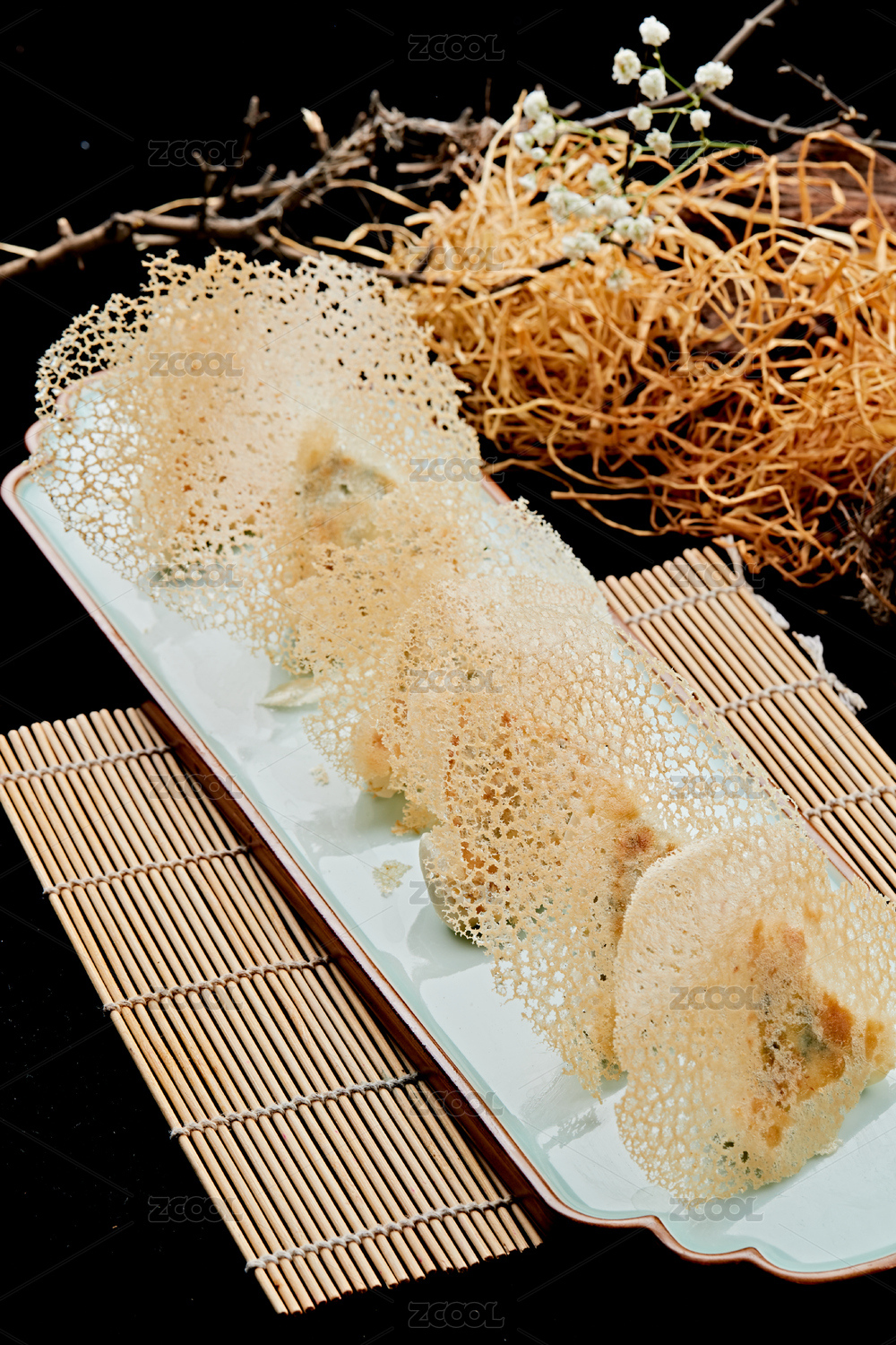 香煎虾肉马蹄饼摆放在麻布垫子上