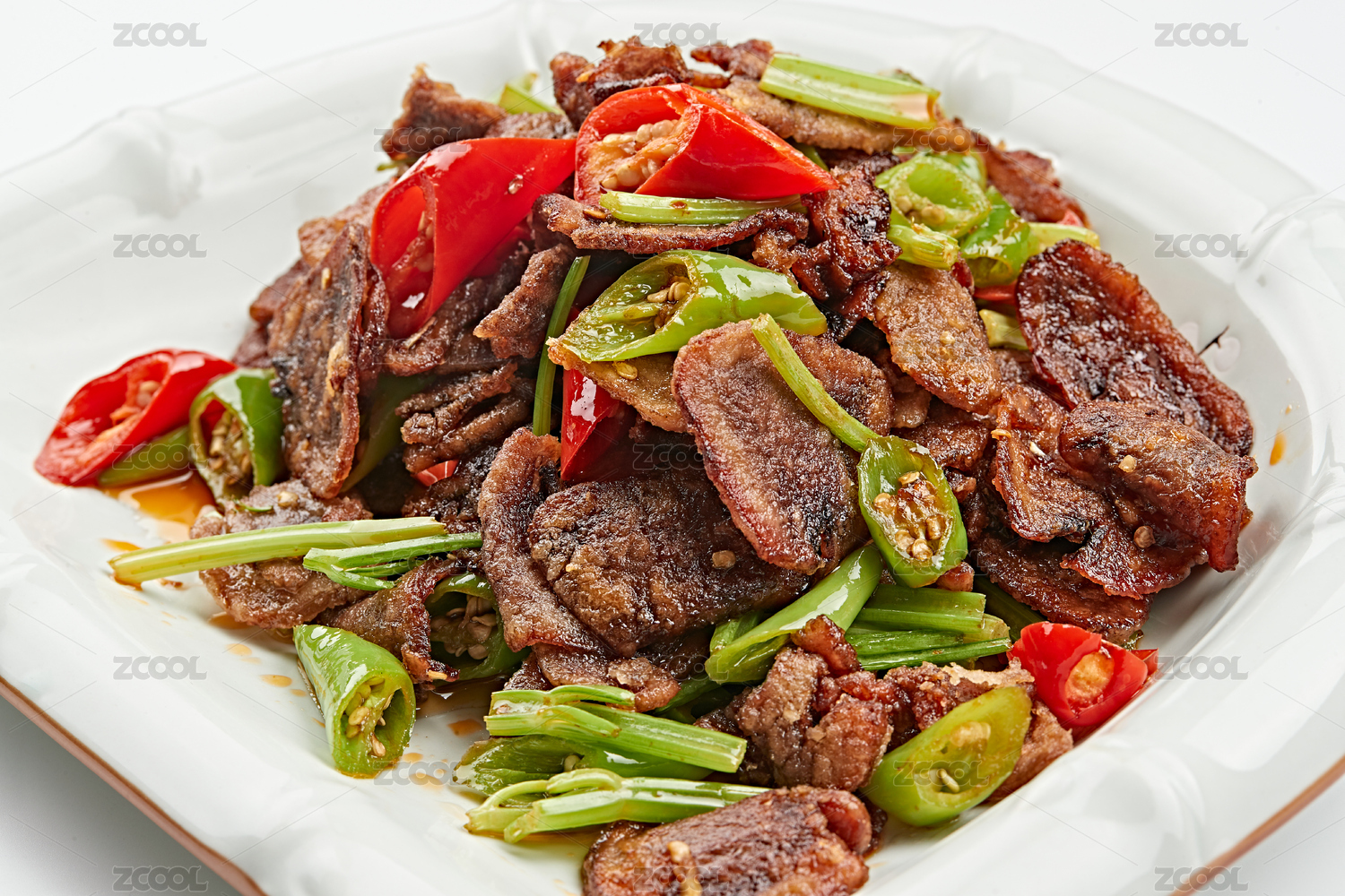白色圆形瓷盘装的杭椒牛五花