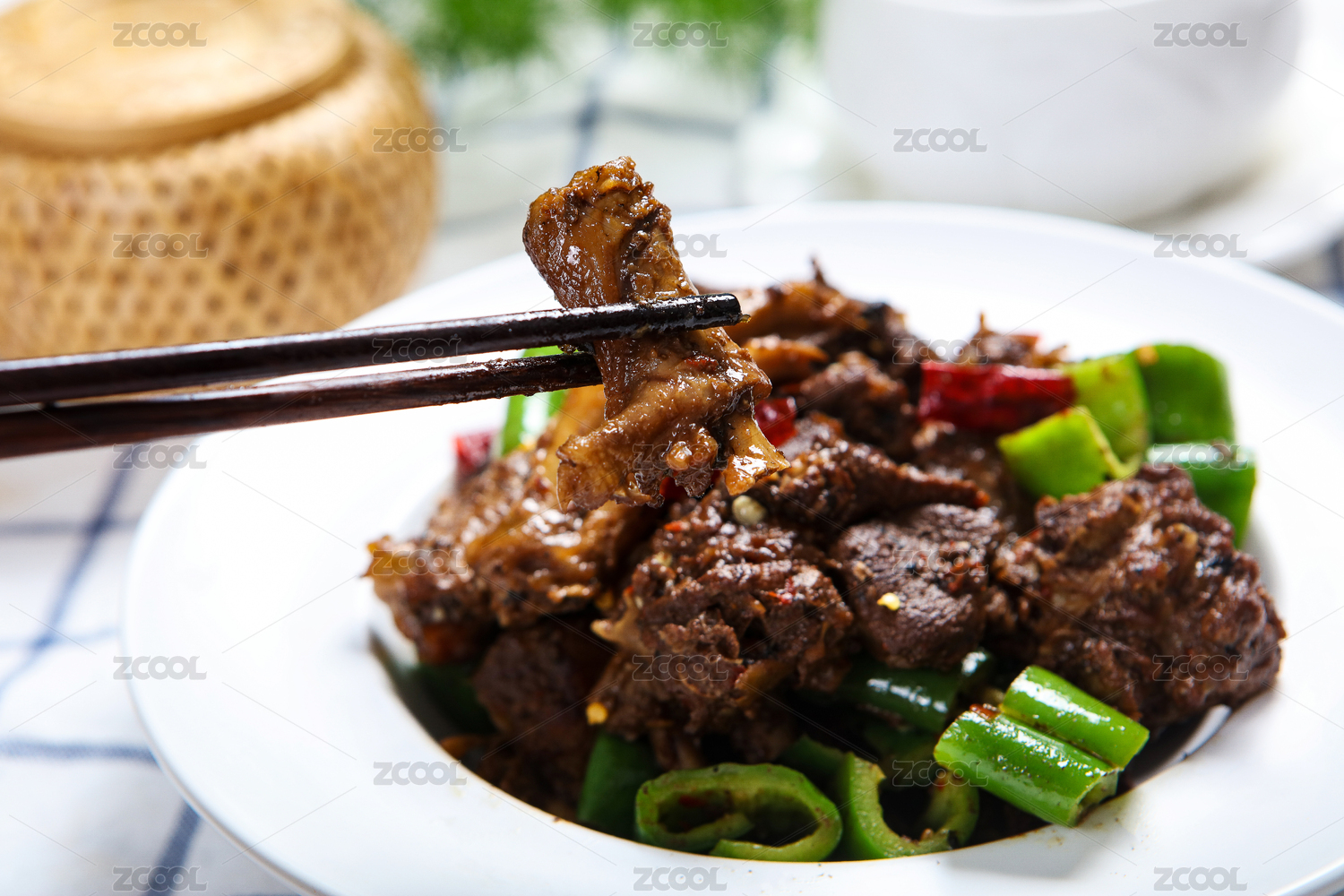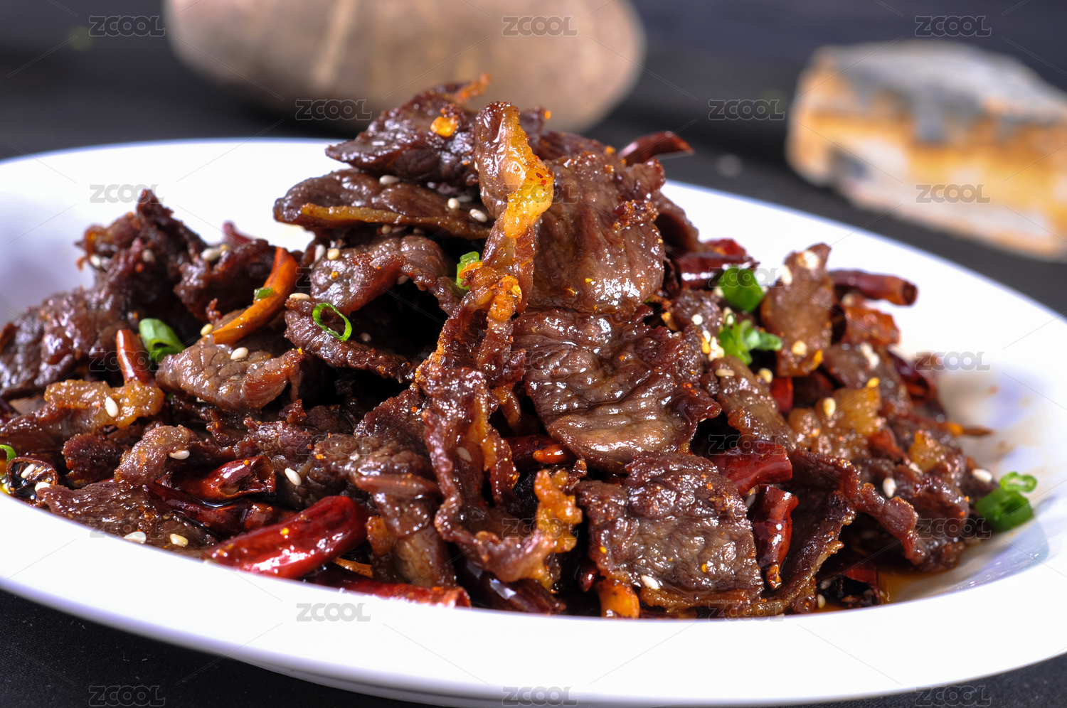 精美瓷餐具装的辣炒牛舌