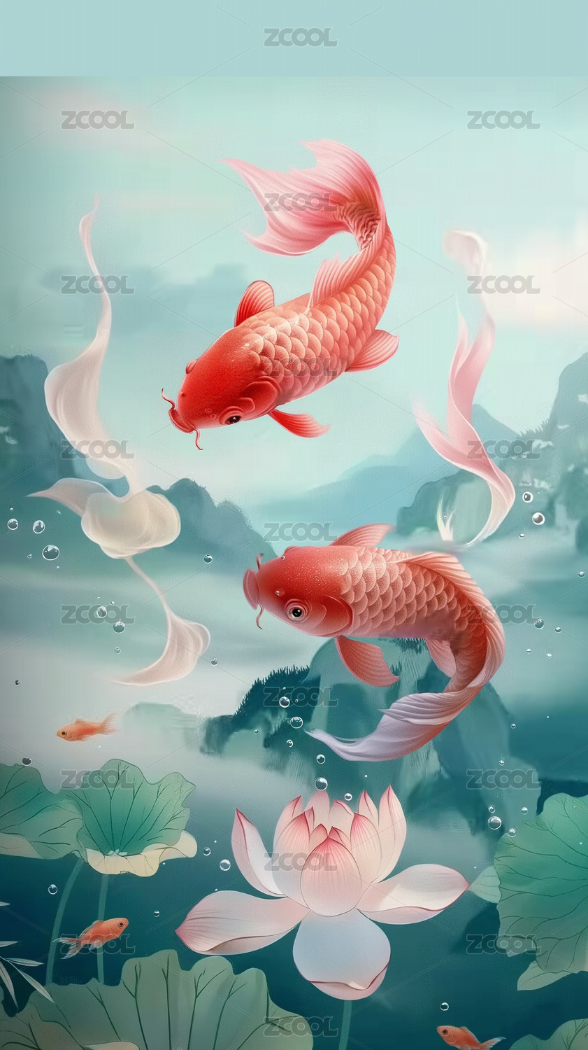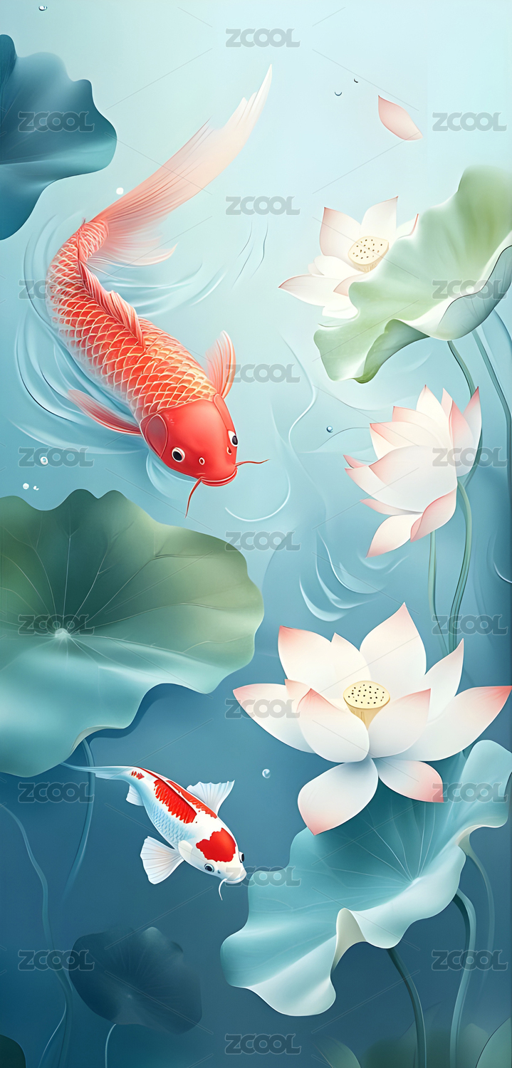 壁纸,装饰画,插画,金鱼,莲花,封面,贴纸,卡片,童装,印染图案