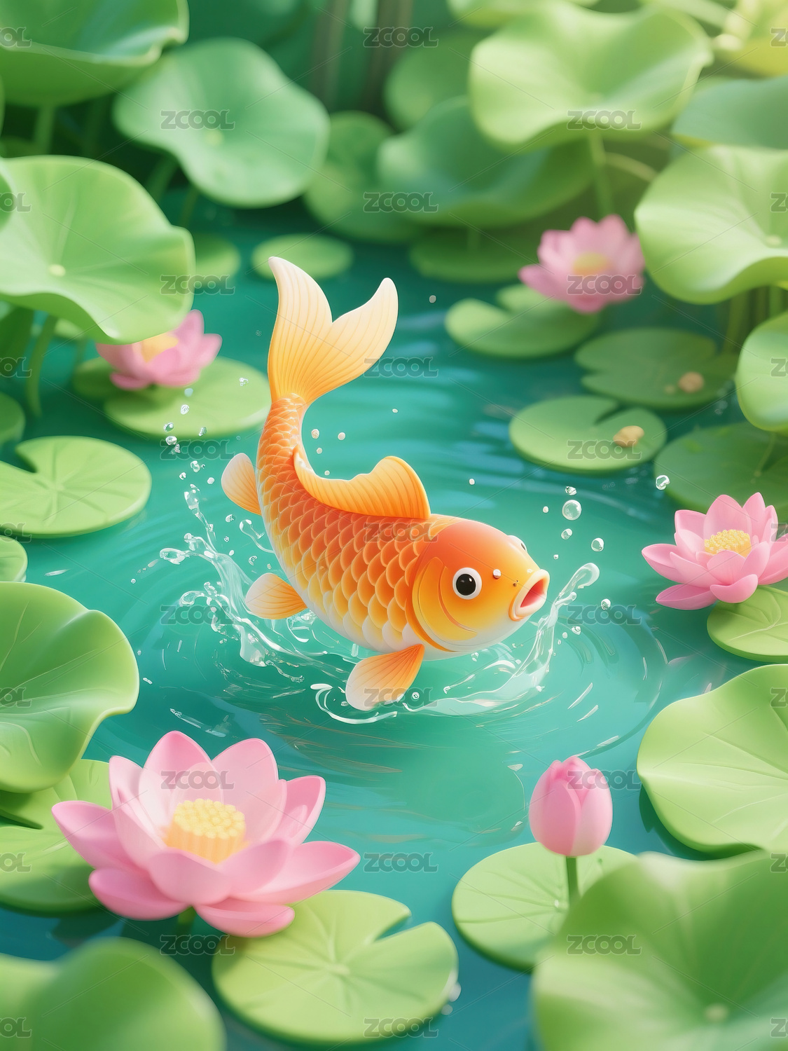 三维锦鲤和荷花
