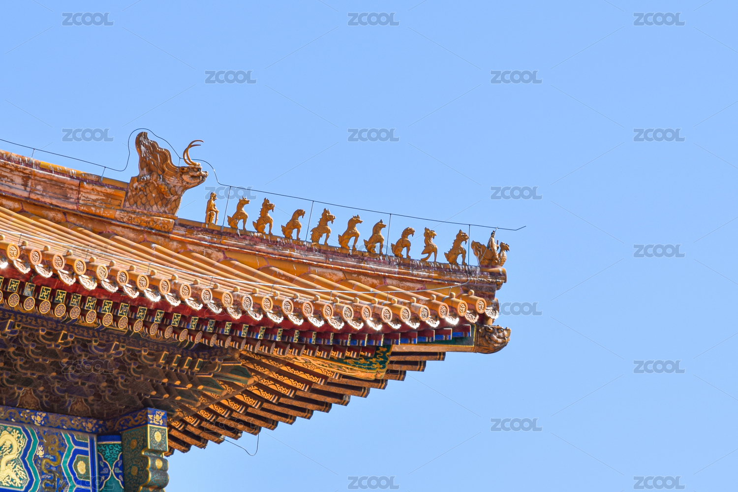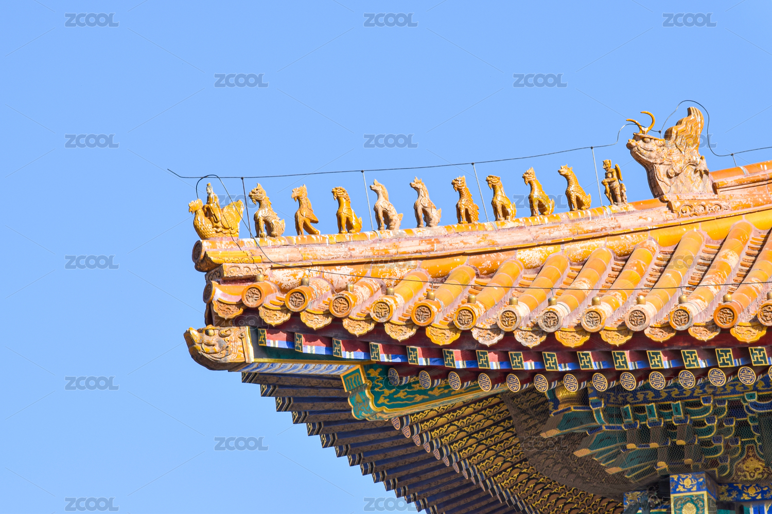 中国北京故宫博物院古建一角——琉璃瓦屋顶、瑞兽