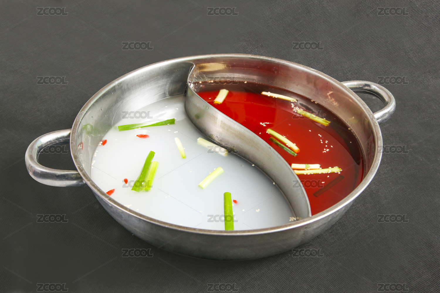 放在餐桌上的鸳鸯火锅,旁边还摆在火锅食材