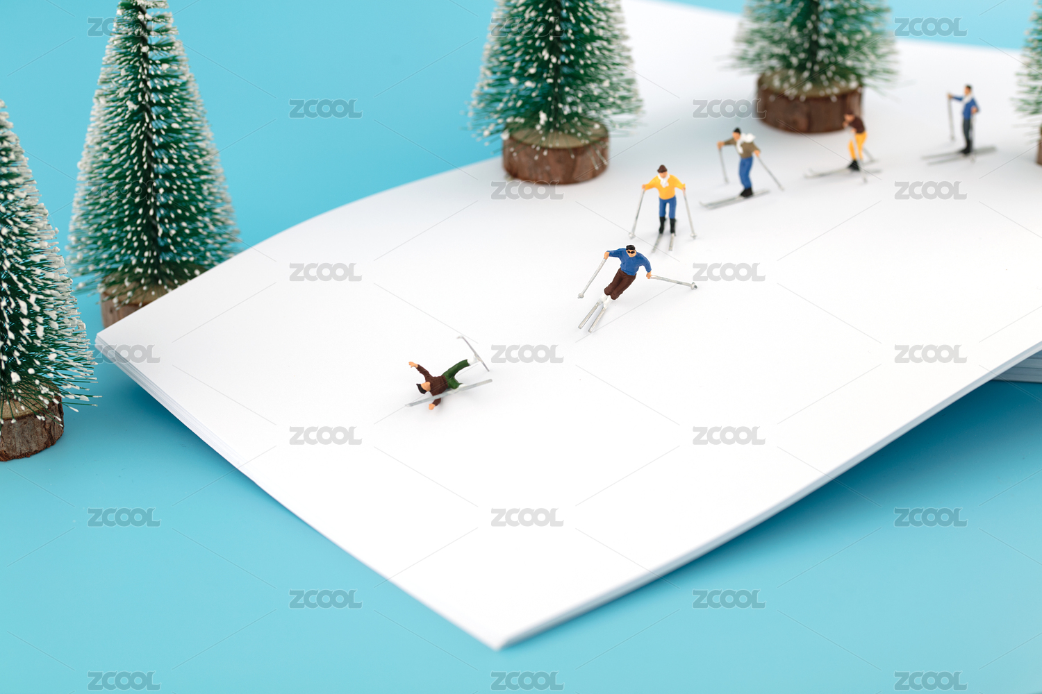 微缩创意雪山脚下拿着行李去酒店民宿的游客