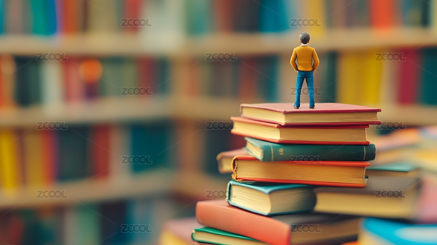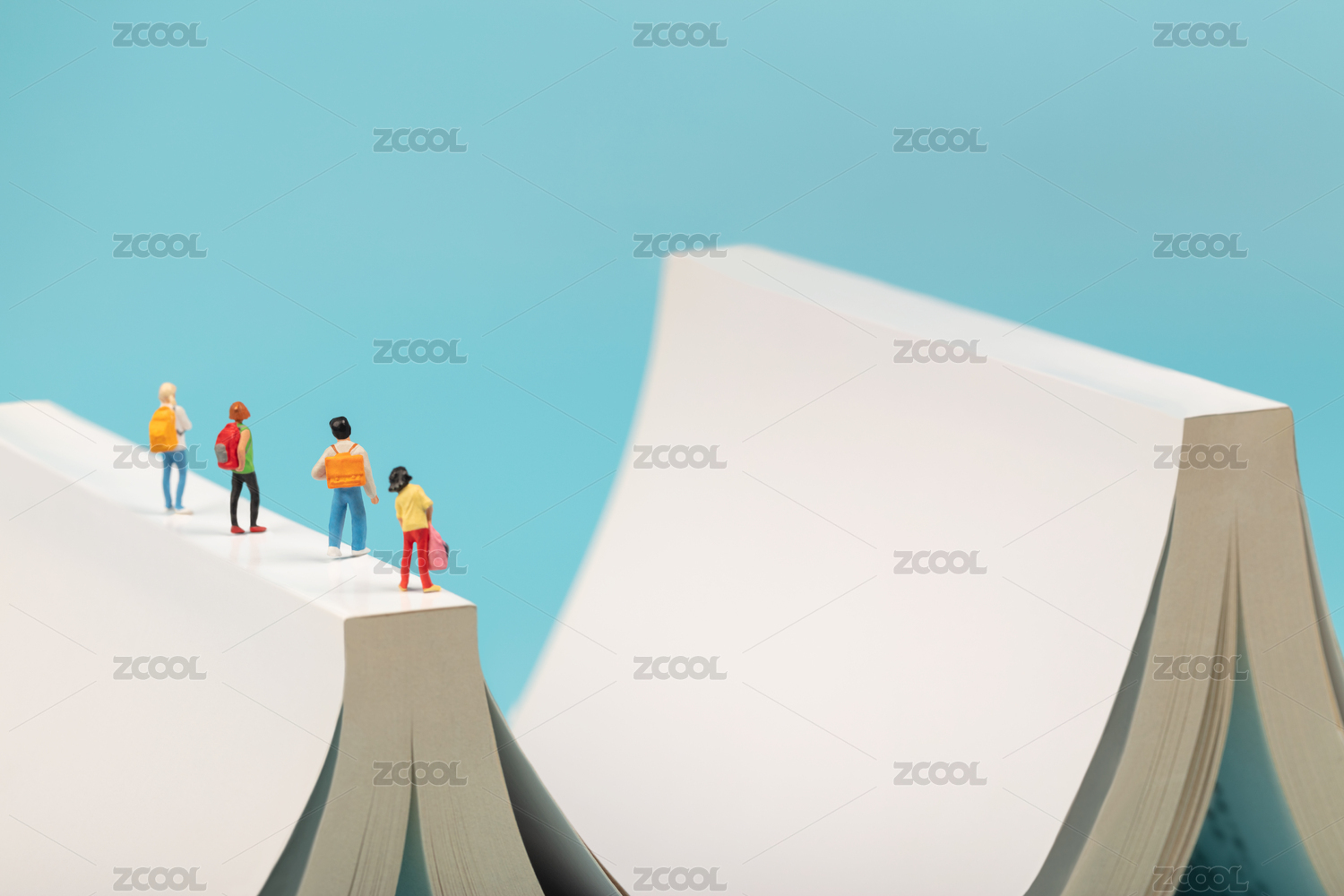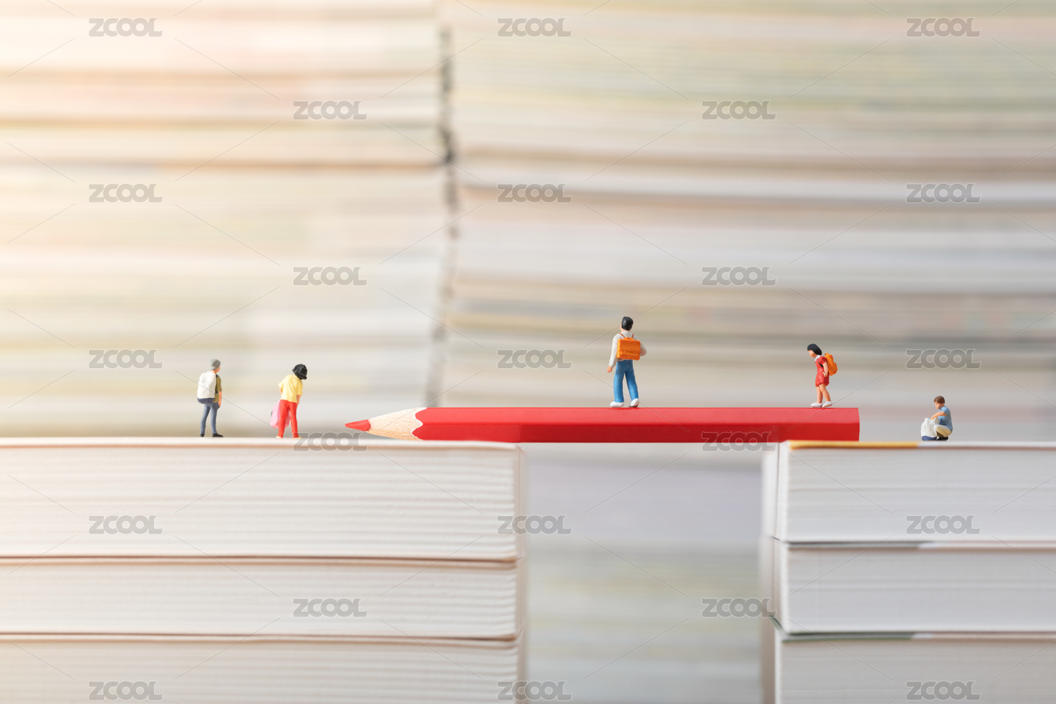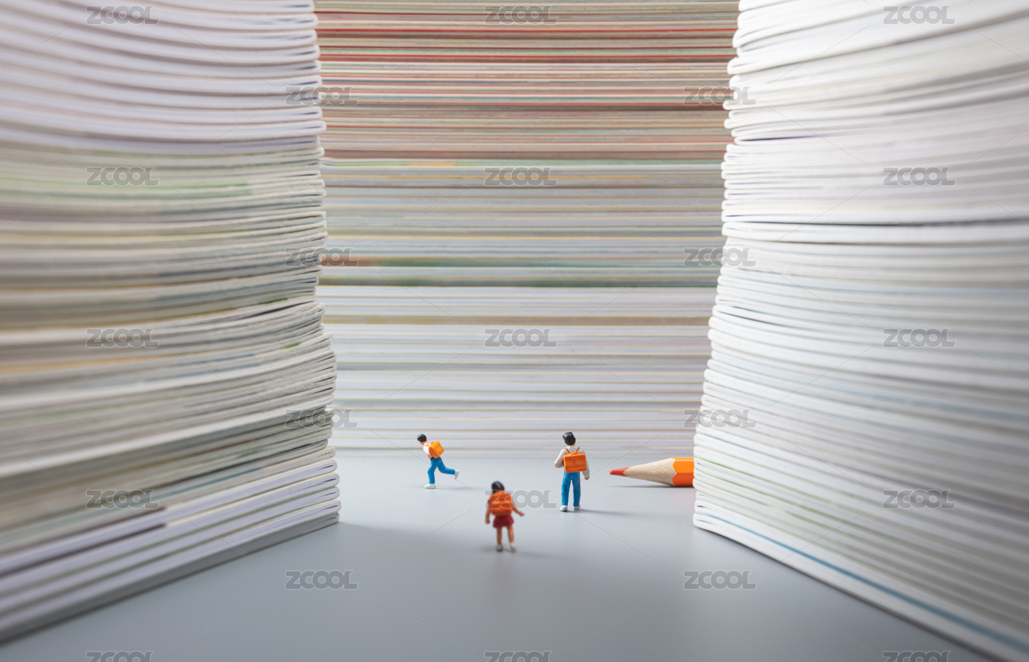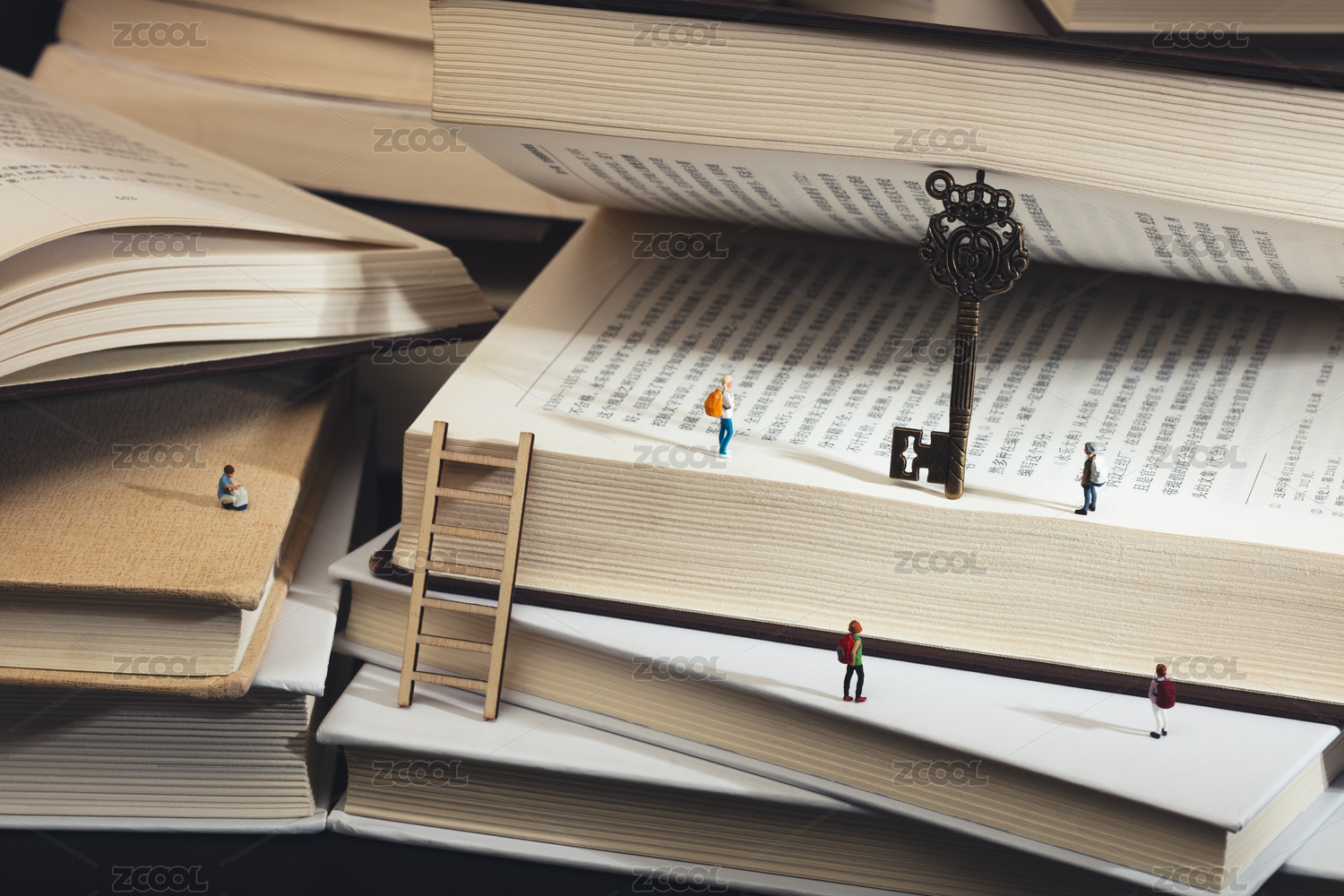 组成阶梯状的书本和上面打闹的儿童人偶模型