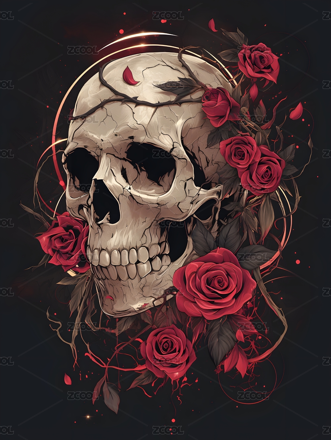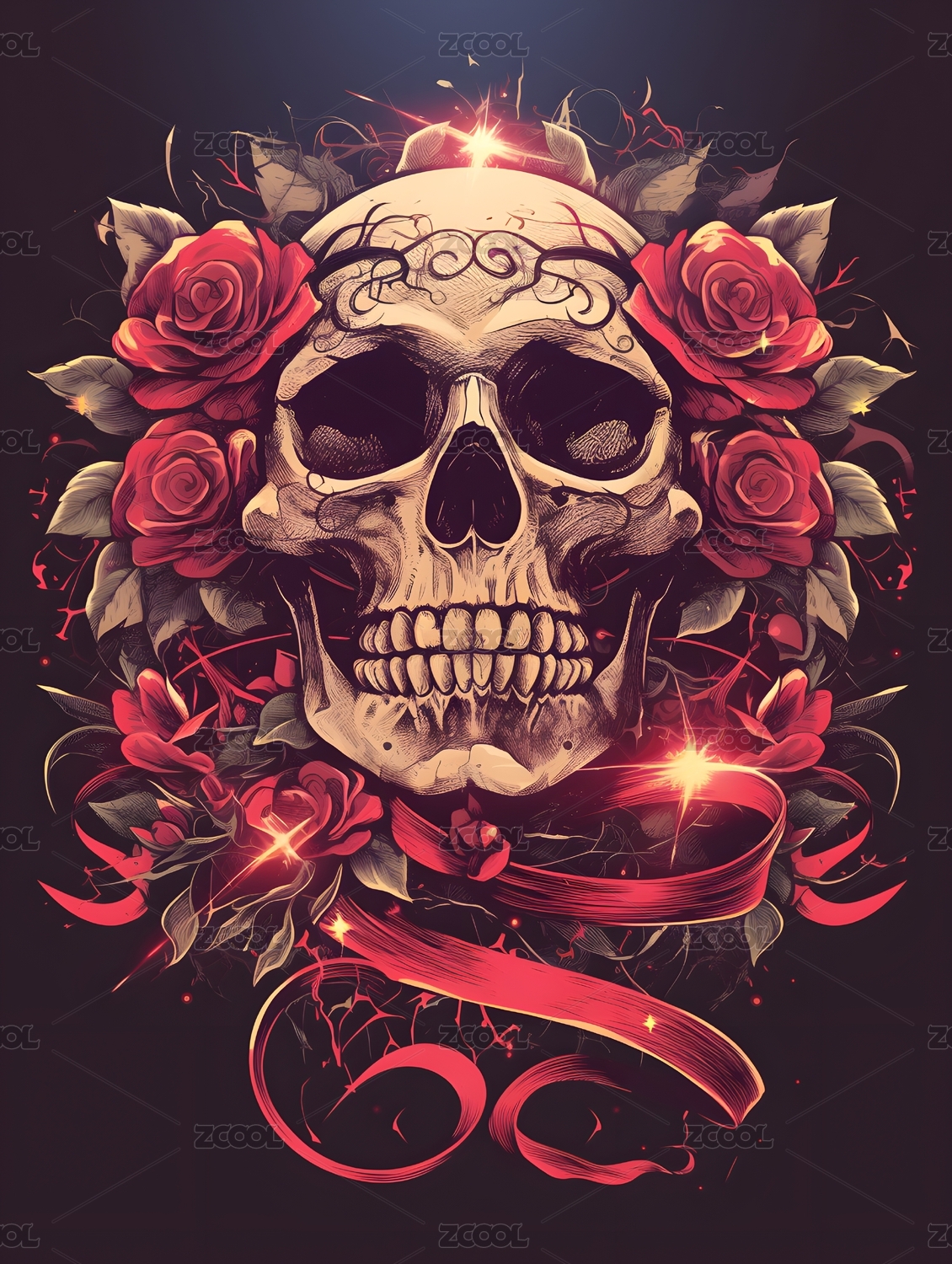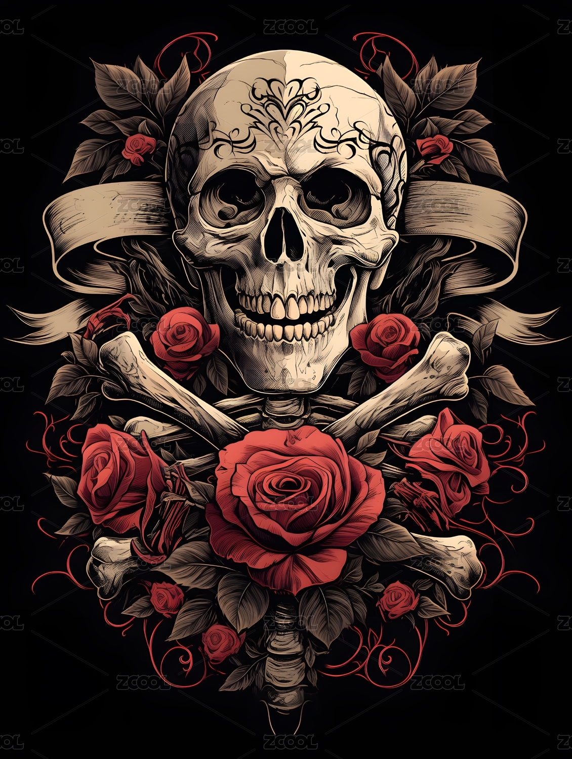 复古美式环绕玫瑰花的骷髅头骨装饰插画