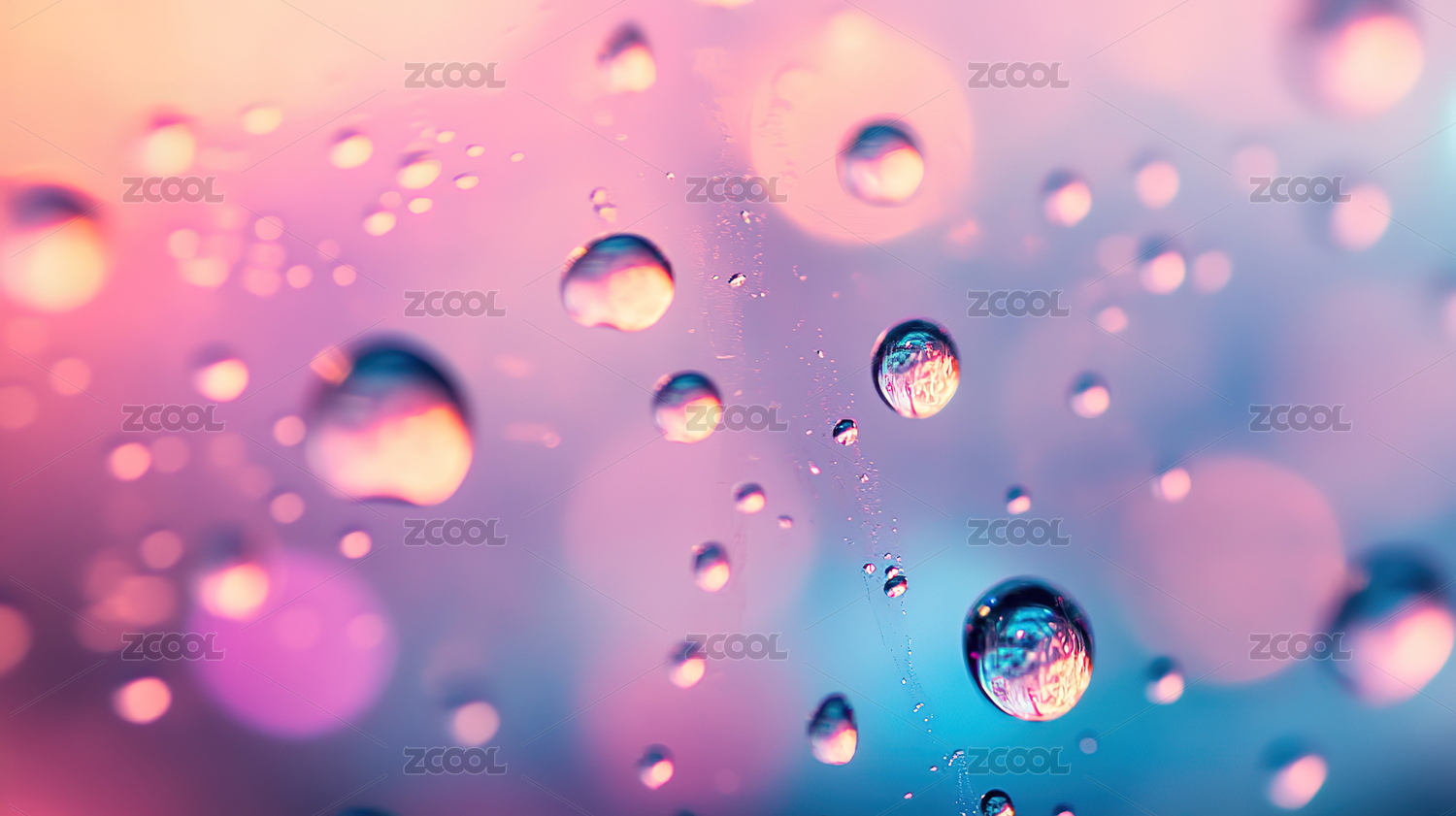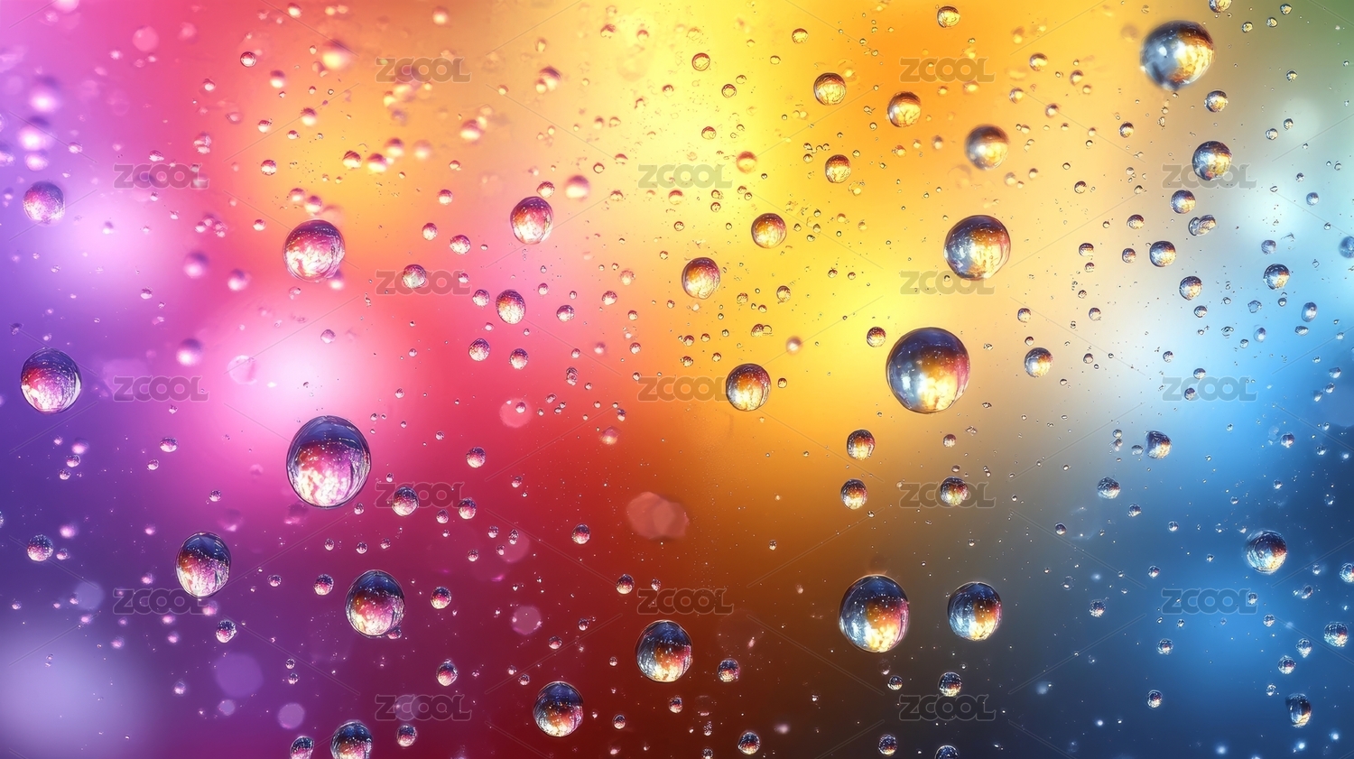 明亮的背景,透明水滴在光滑的彩色表面上,