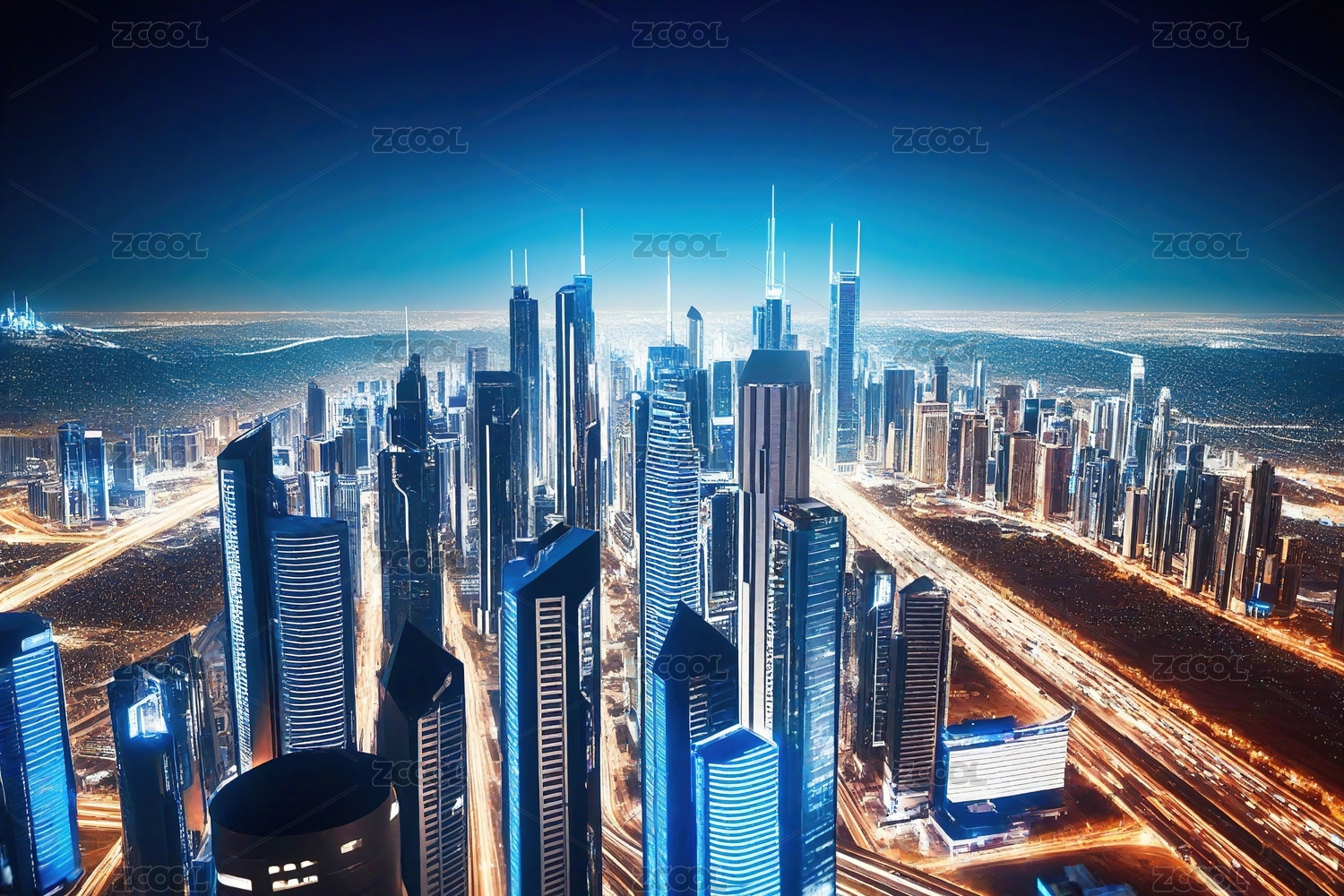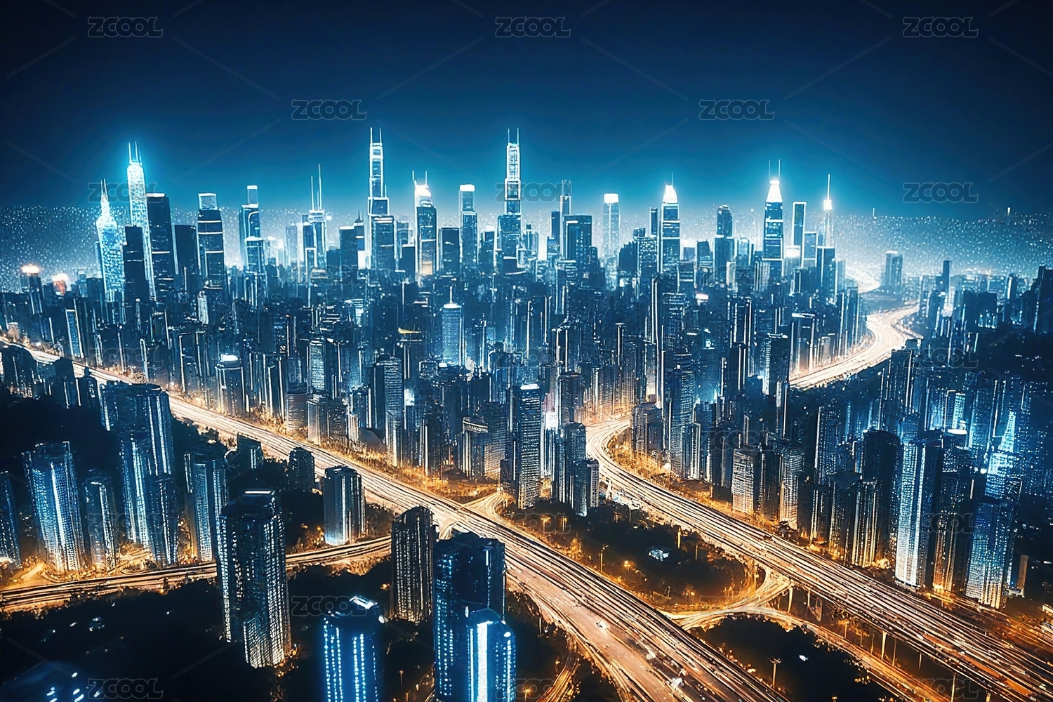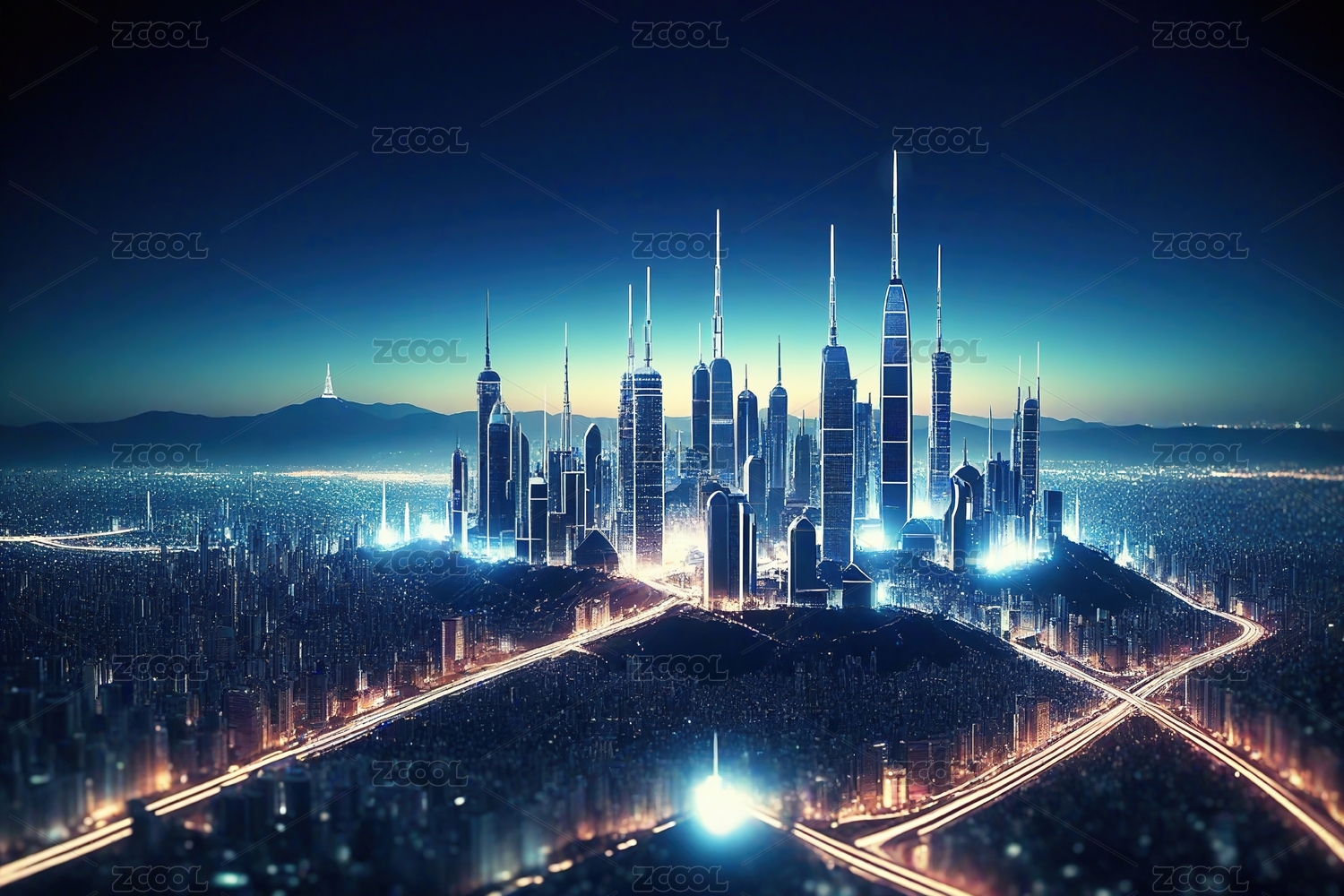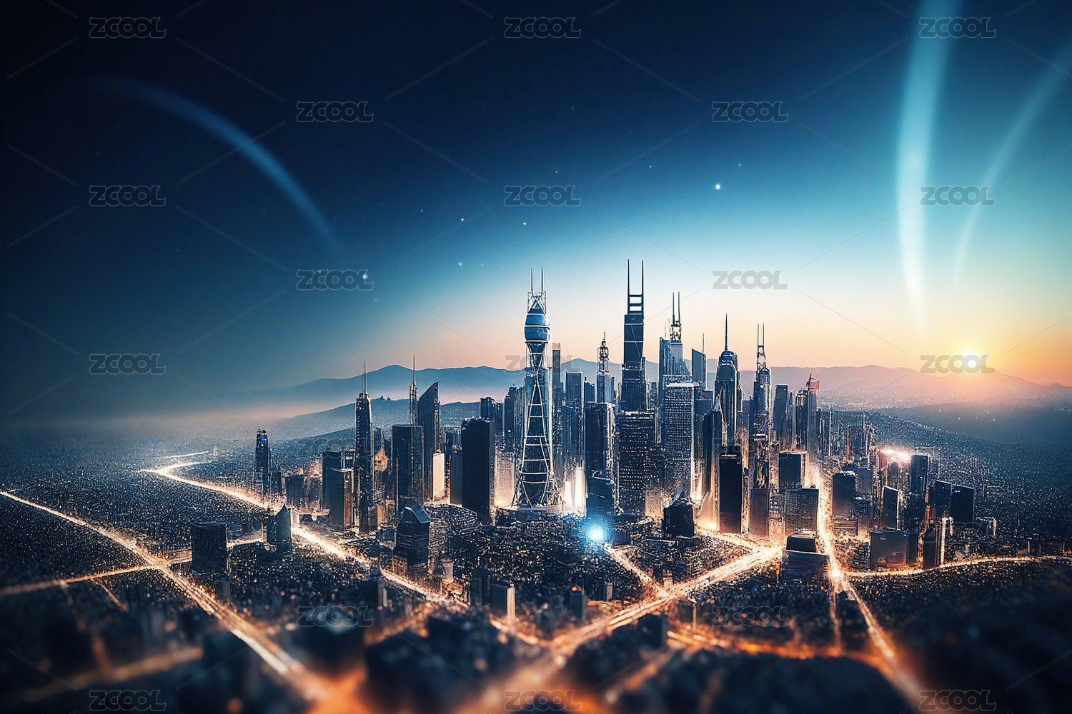 未来,都市,夜景,建筑,摩天大楼,灯光,道路,车流,天空,星光