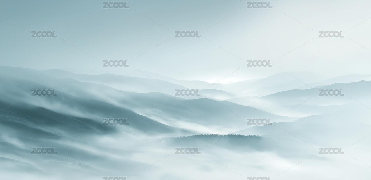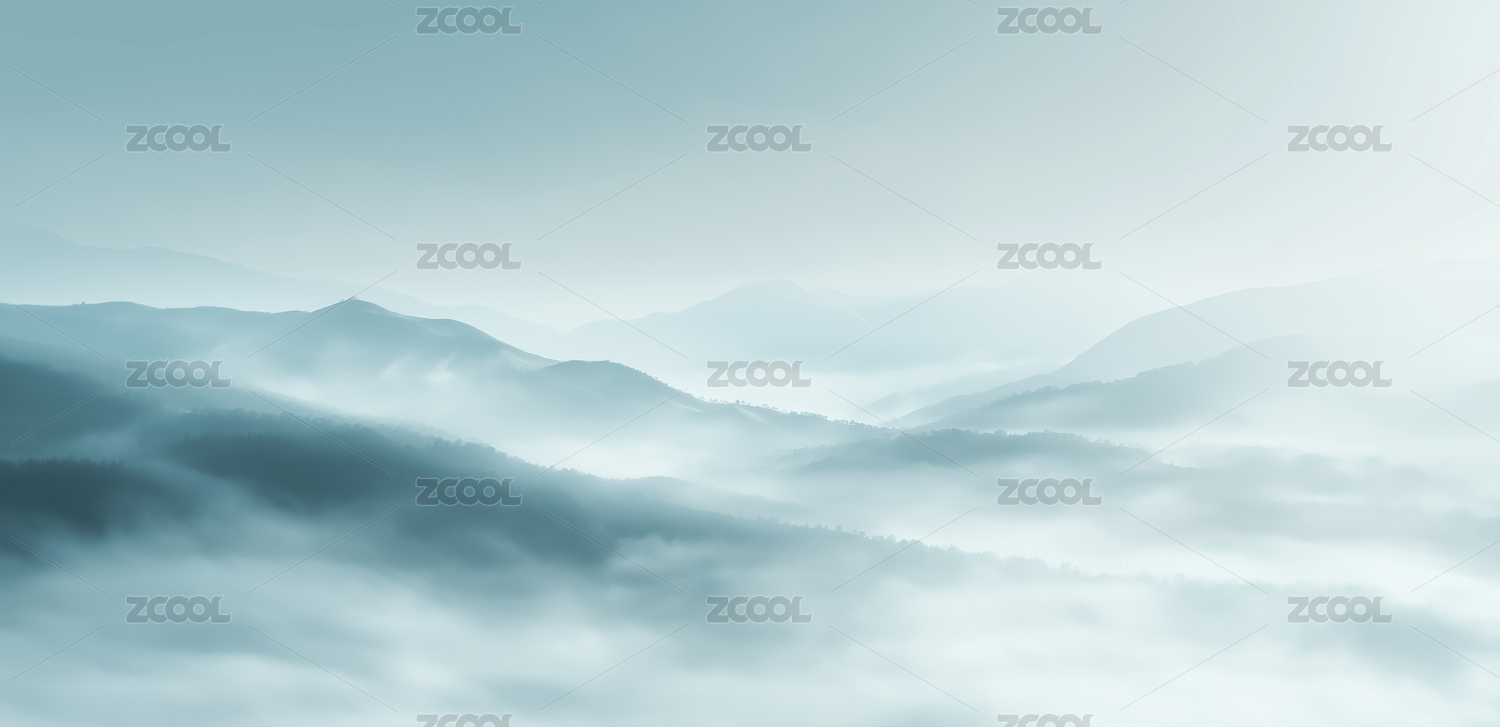 淡蓝背景下群山隐于云雾间营造空灵治愈的山