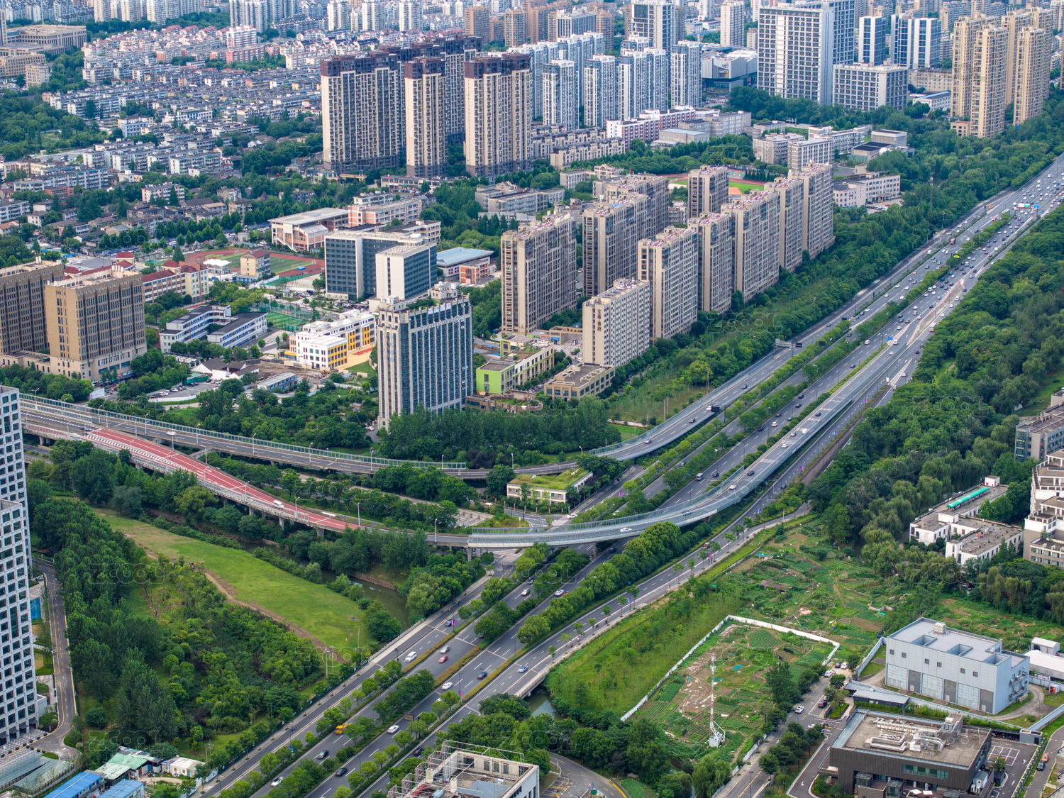 城市,高楼,大厦,建筑,道路,绿化,带状公园,河流,桥梁,交通