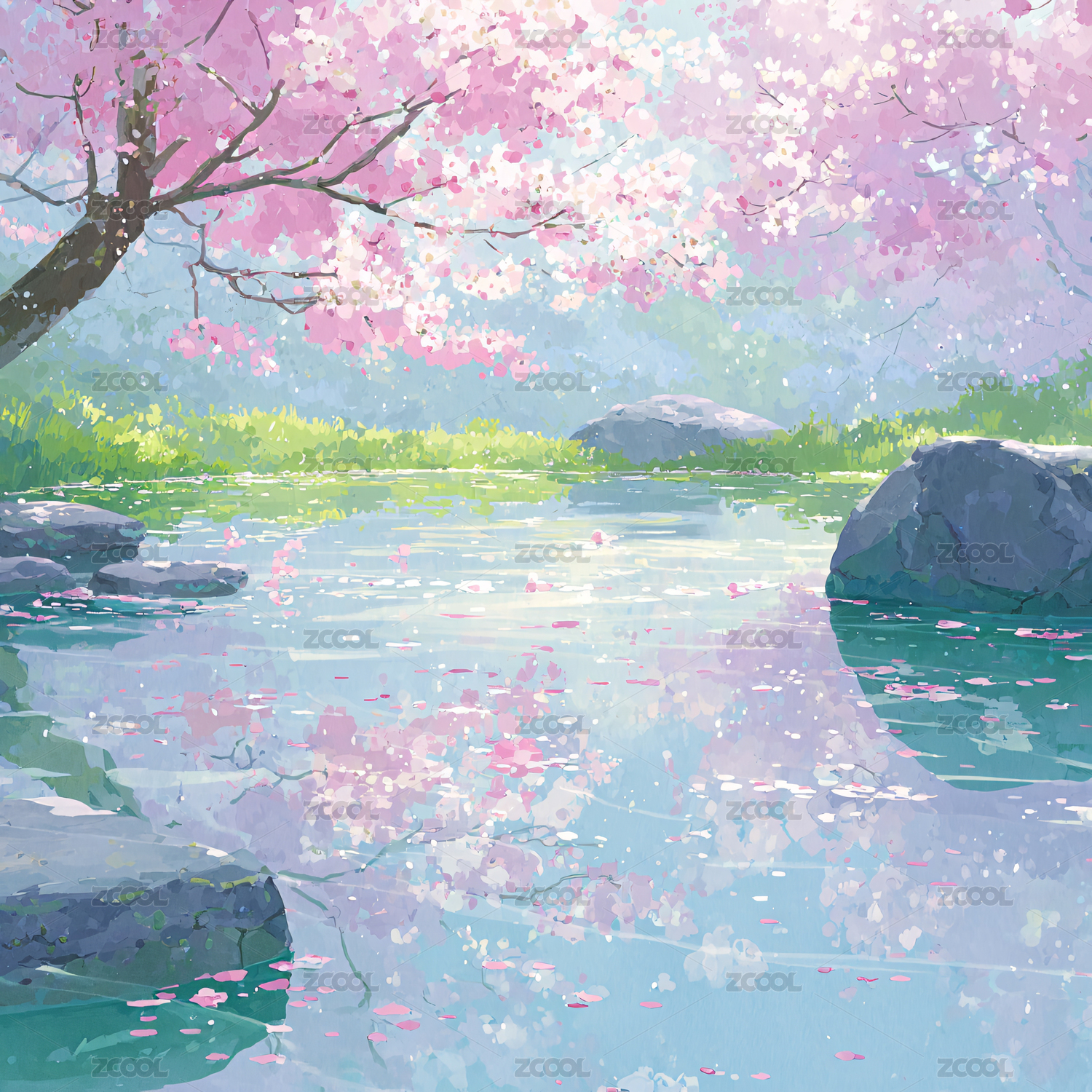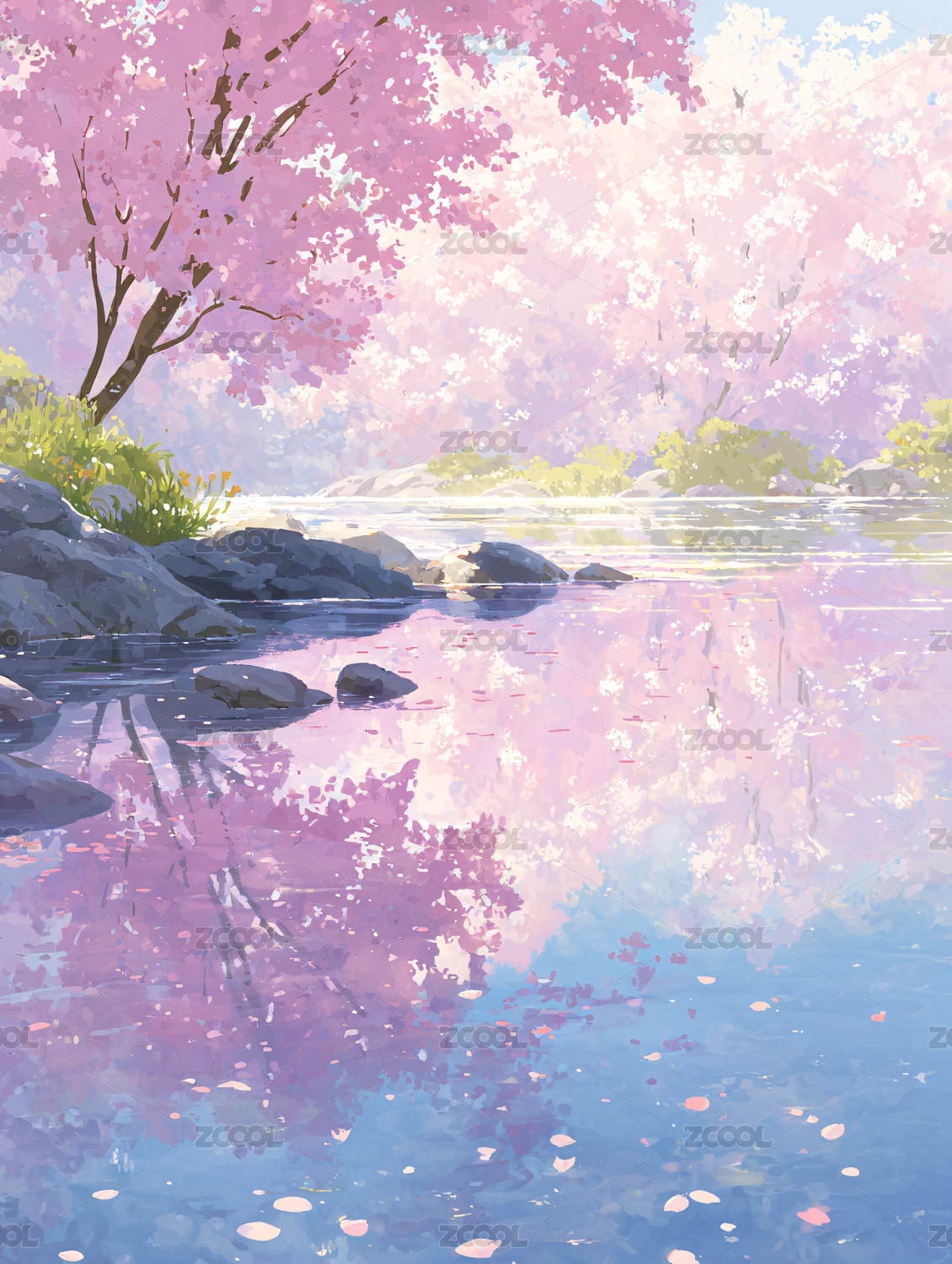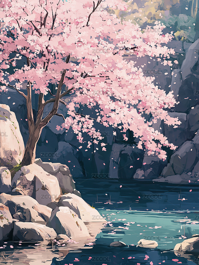 樱花树下的静谧湖面