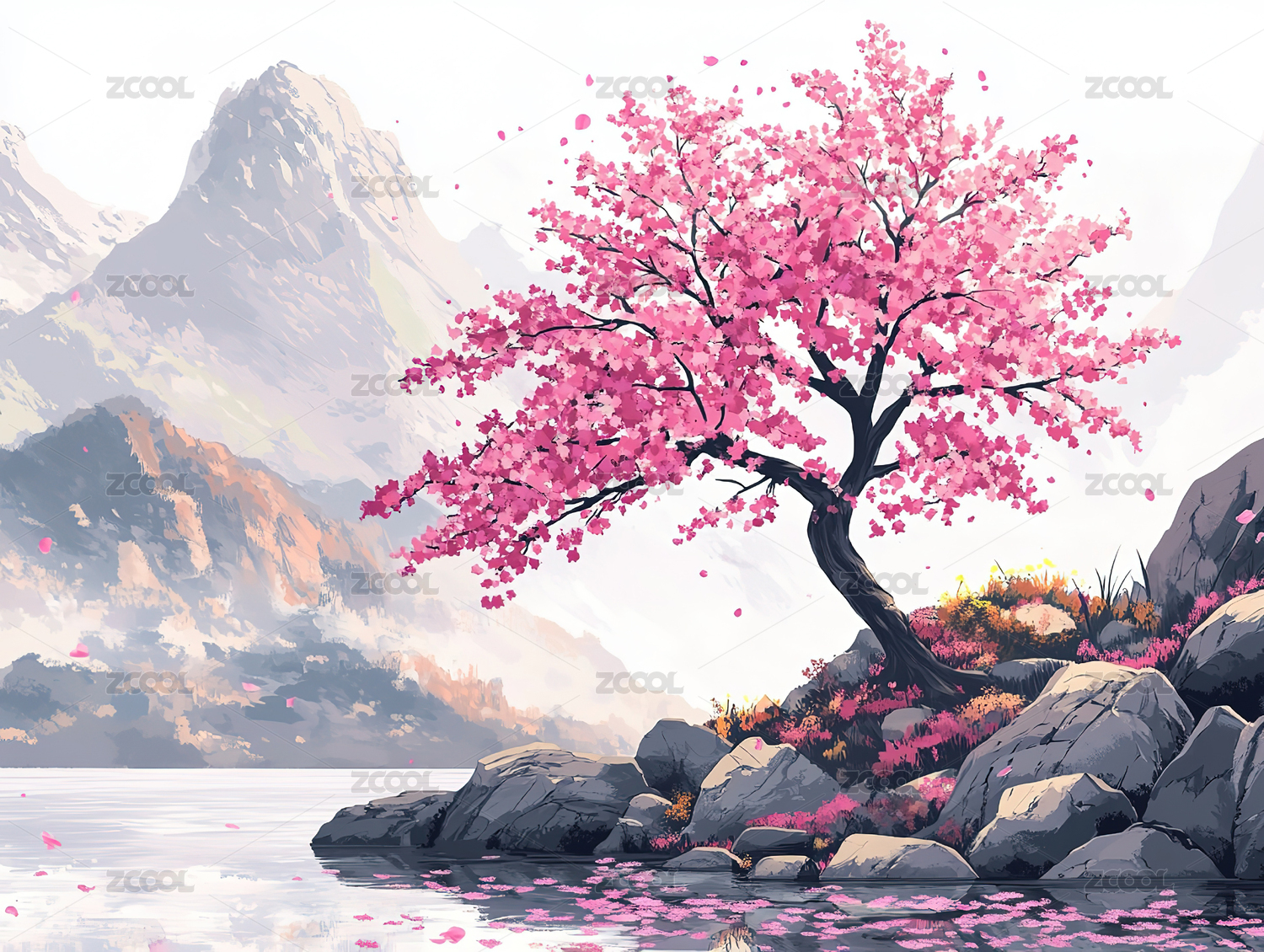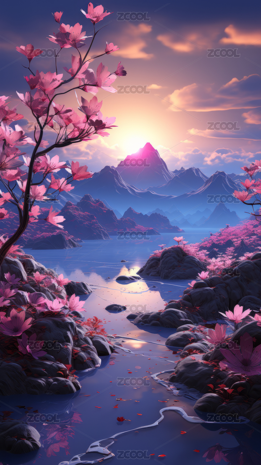 粉色桃花山水落日风景