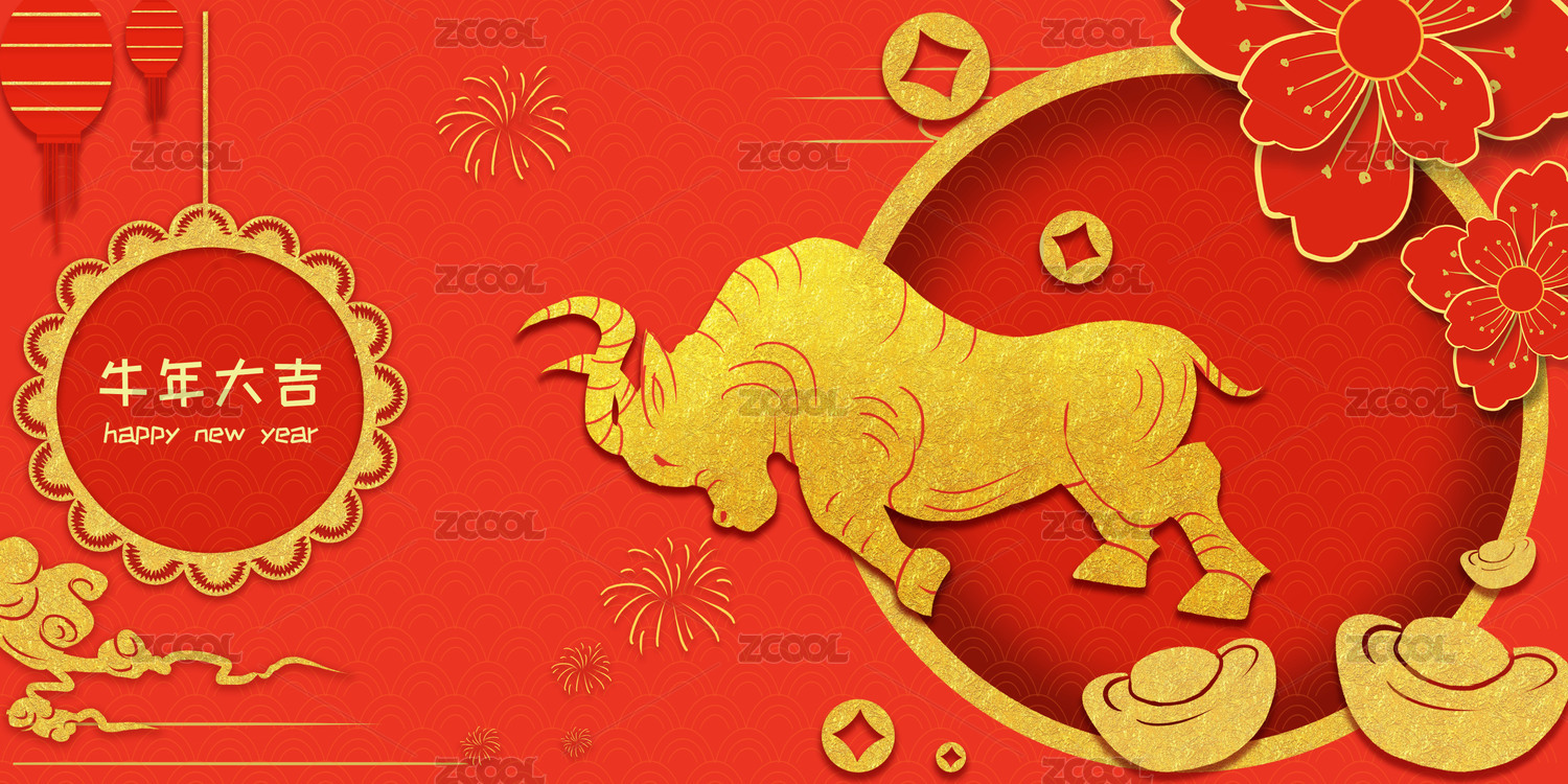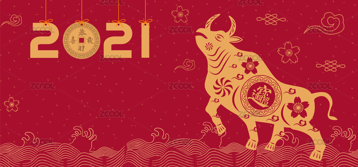 2021年春节新年牛年剪纸生肖牛招财进宝