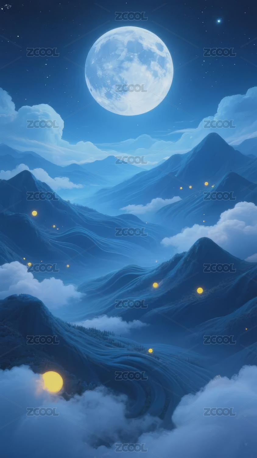 金色月亮下的蓝色山河