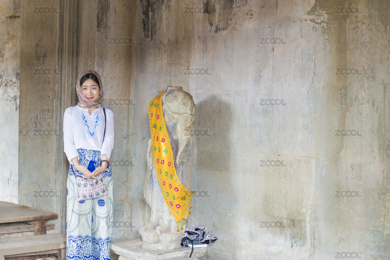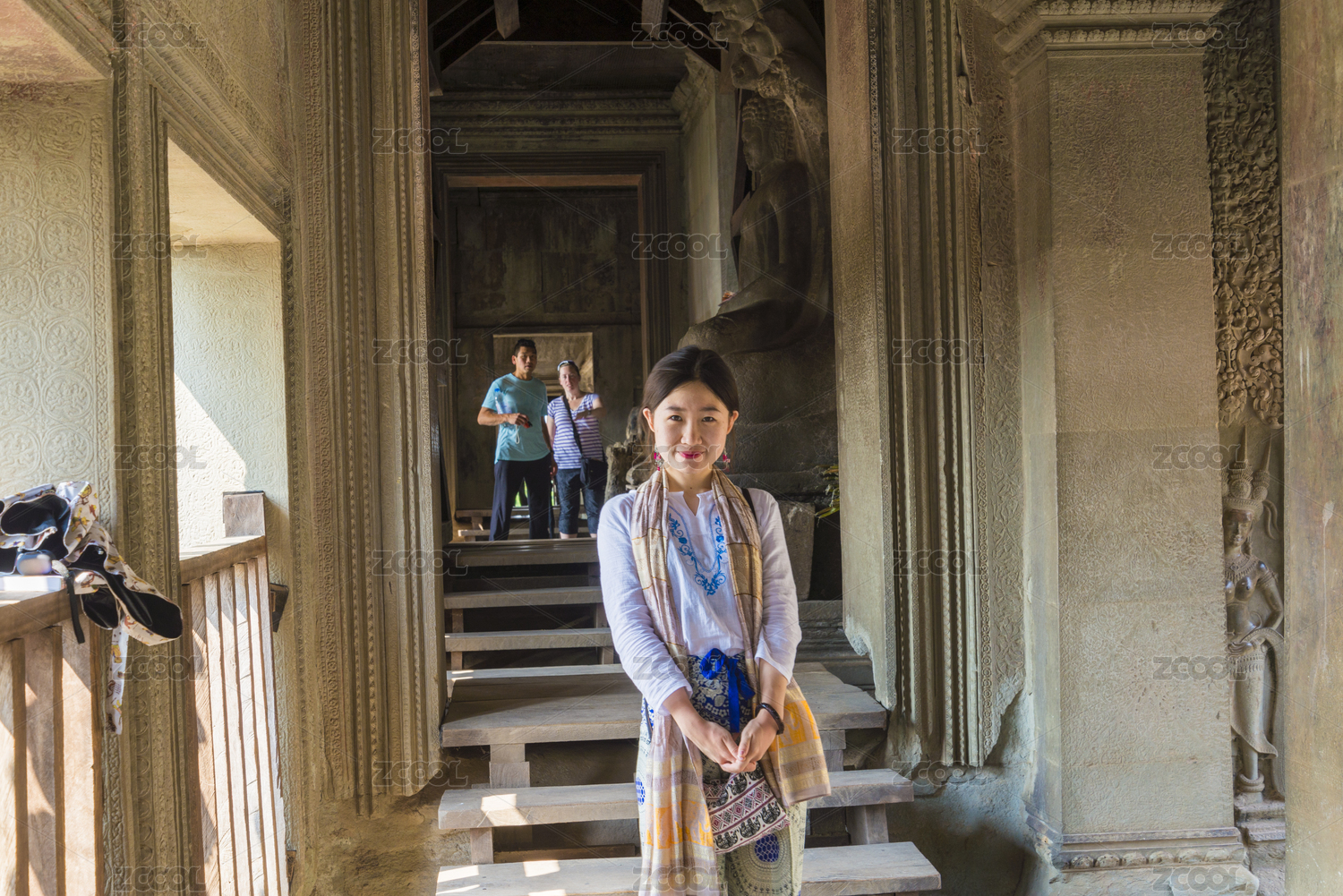 美丽的女孩在吴哥窟游玩