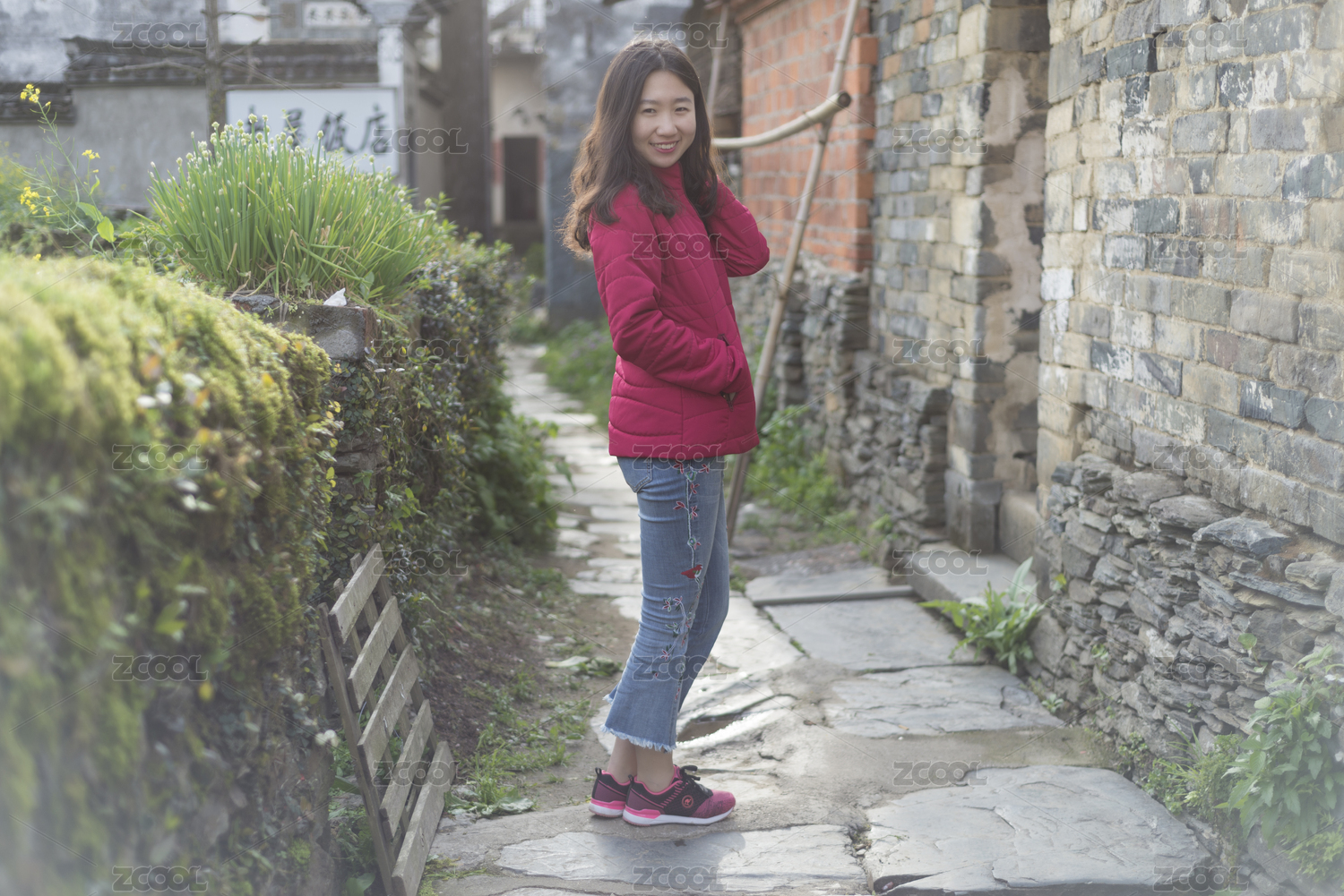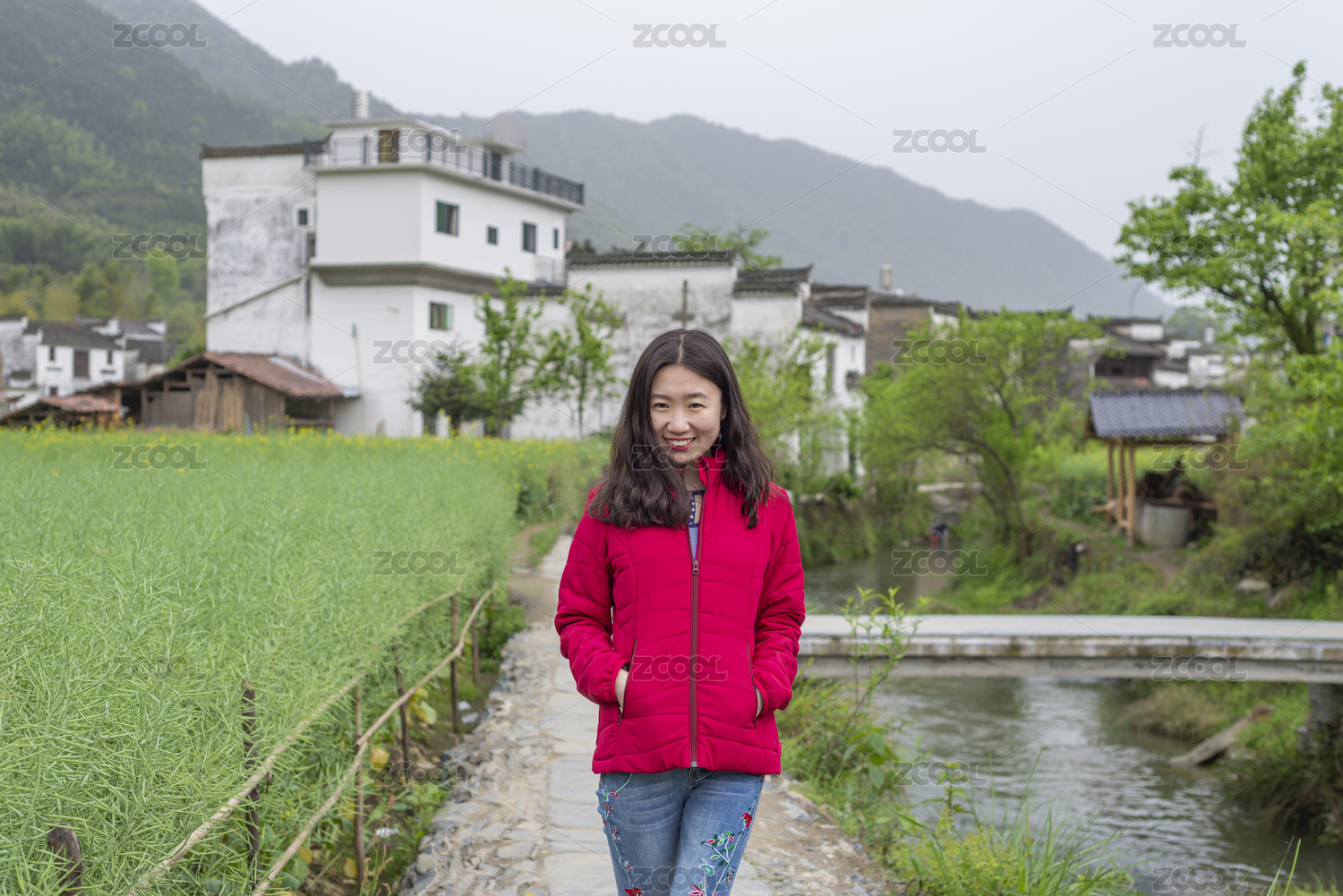 春天在江西婺源庆源村乡村小道的年轻女孩