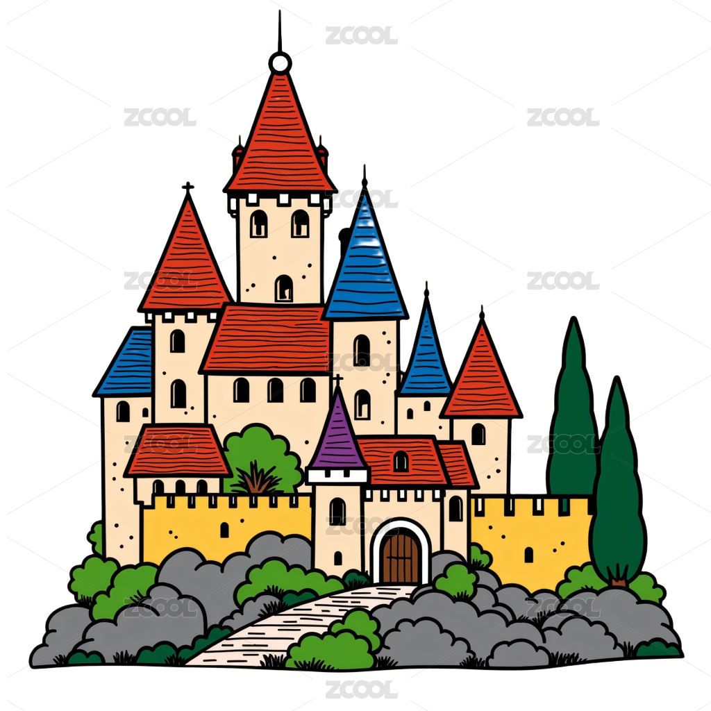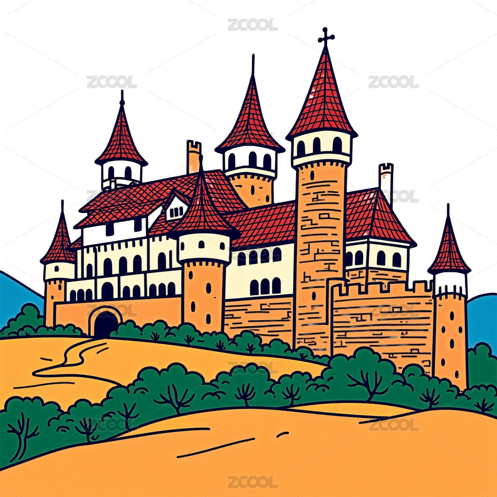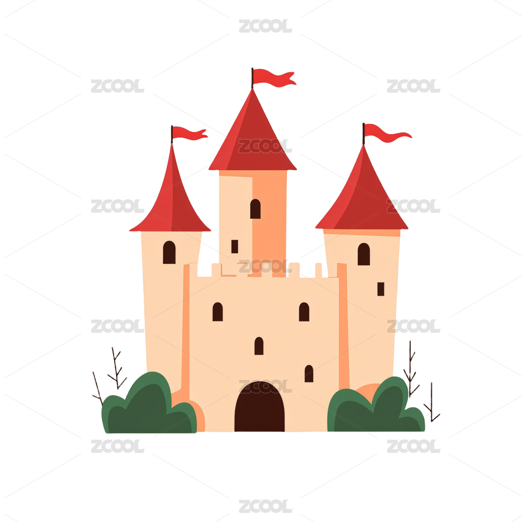 城堡,卡通,旗帜,城墙,砖墙,城门,欧式窗户,场景,建筑