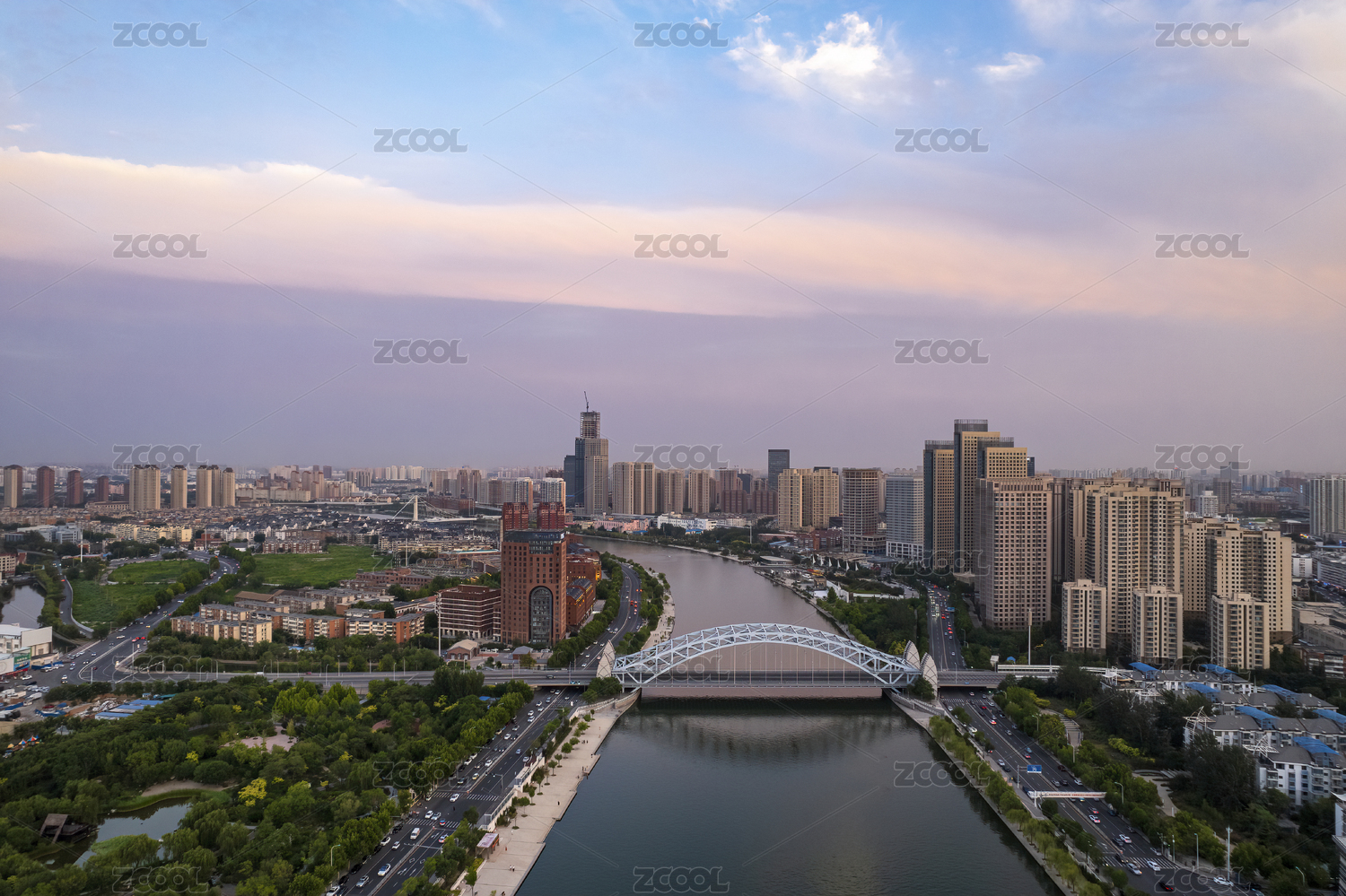 日落天津国泰桥海河沿岸城市建筑风光航拍