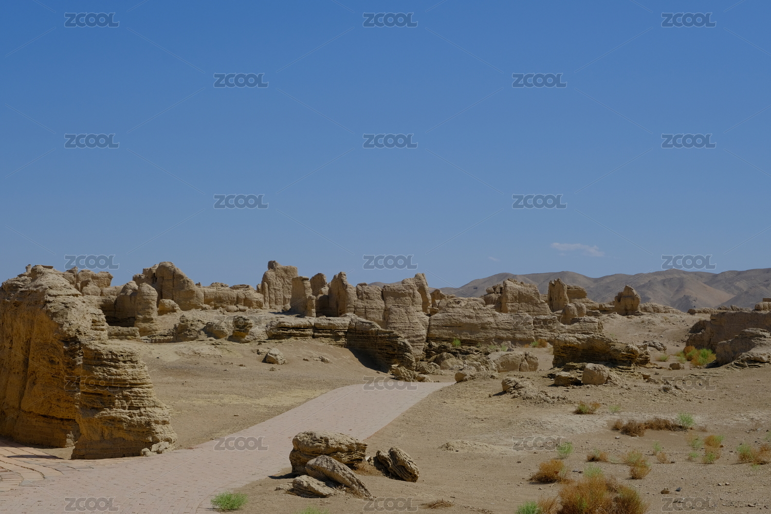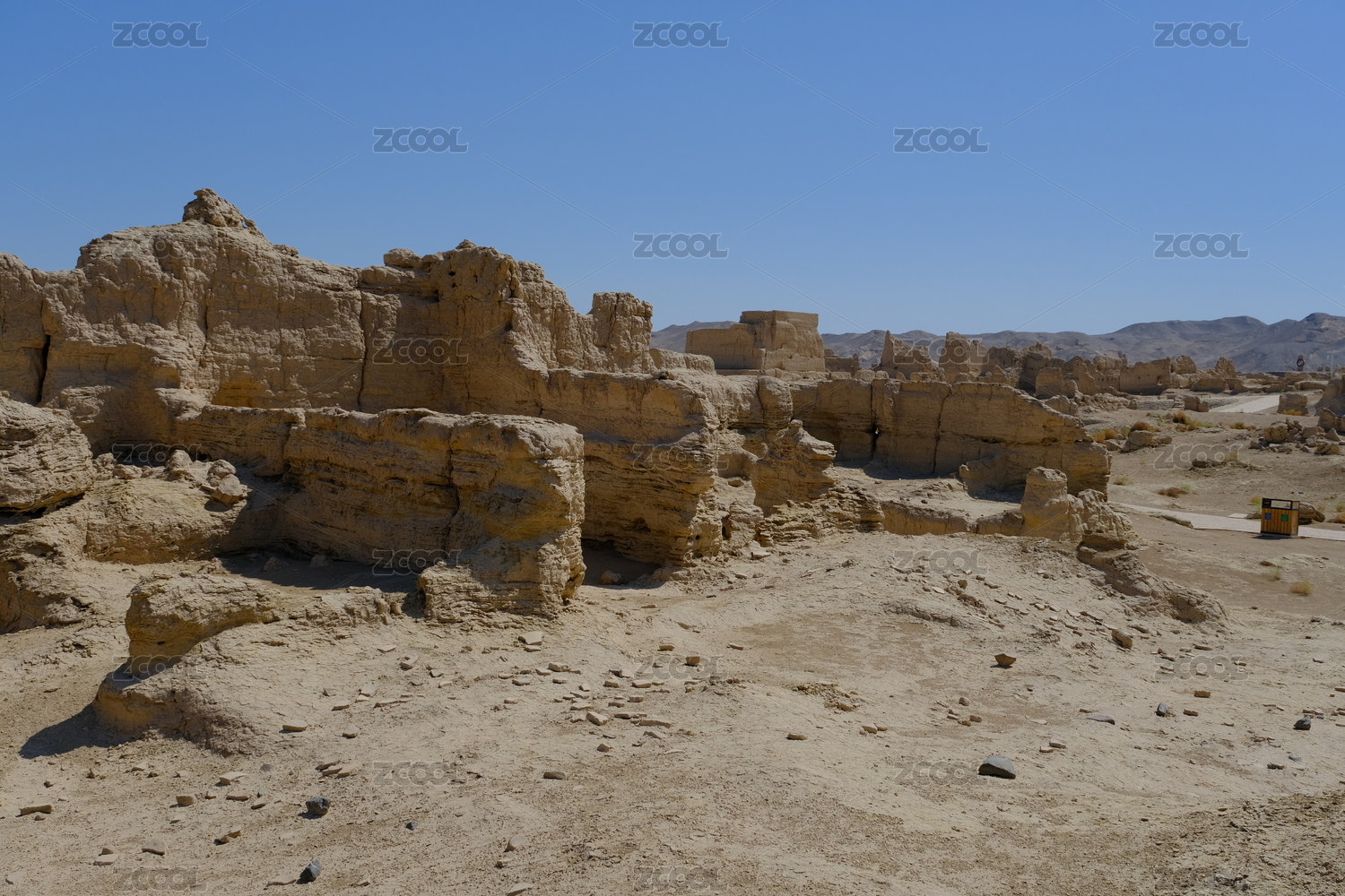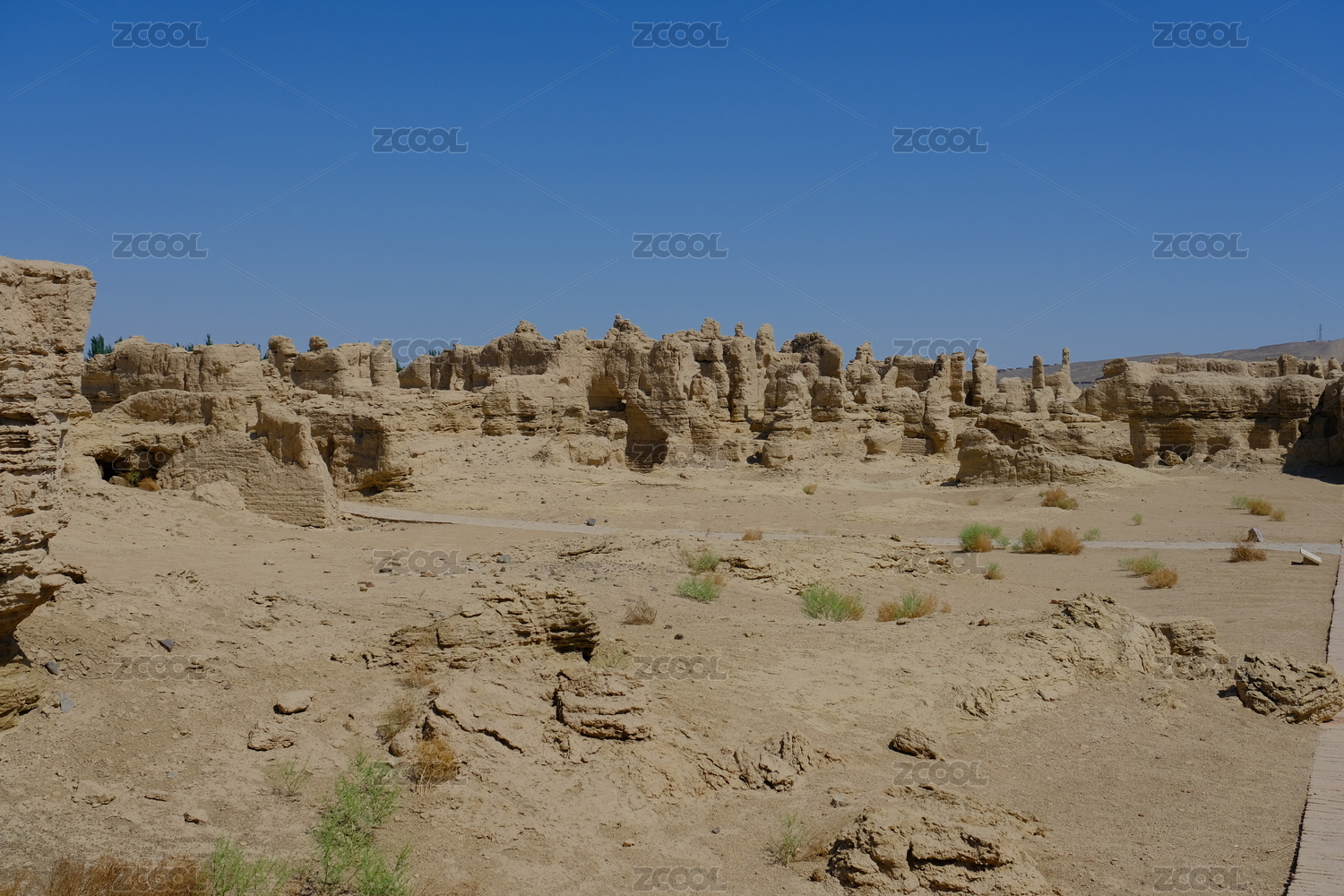 中国新疆吐鲁番交河故城夕阳下的生土建筑