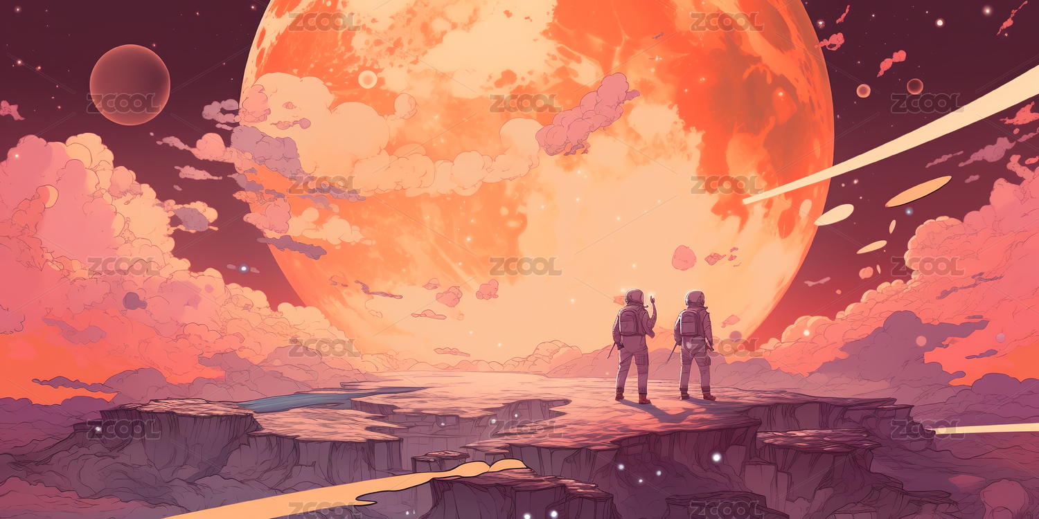 宇航员,步行,沙漠,红色,日落,场景,外星人,景观,户外,插画