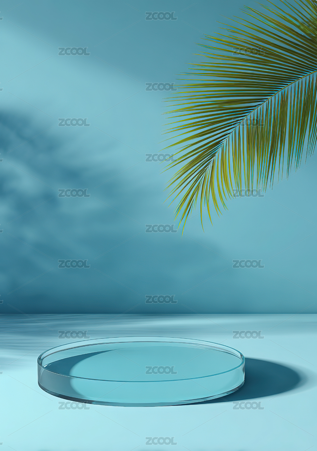 蓝色背景下的圆形展台与棕榈叶影