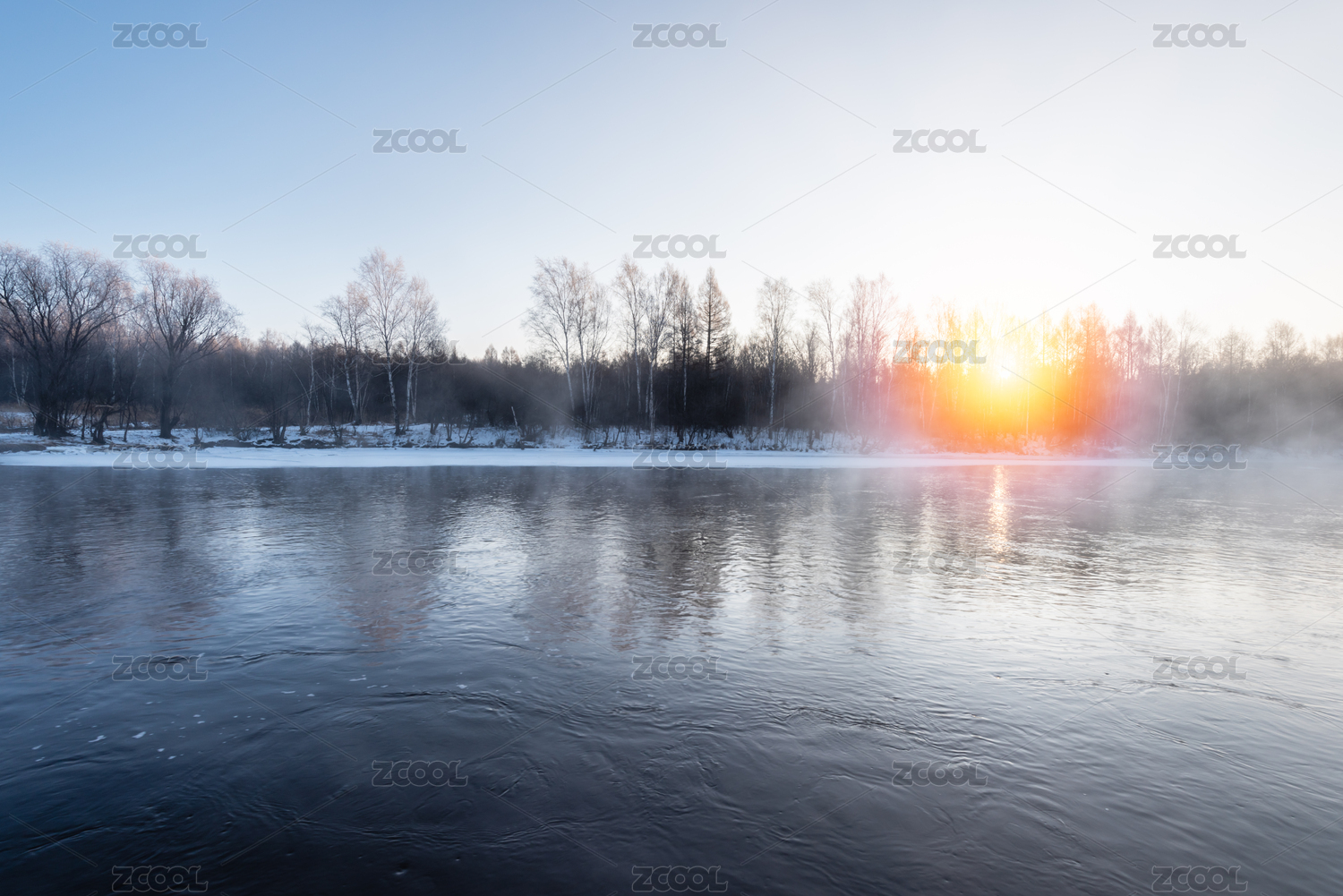 冬天雪地河流雾凇