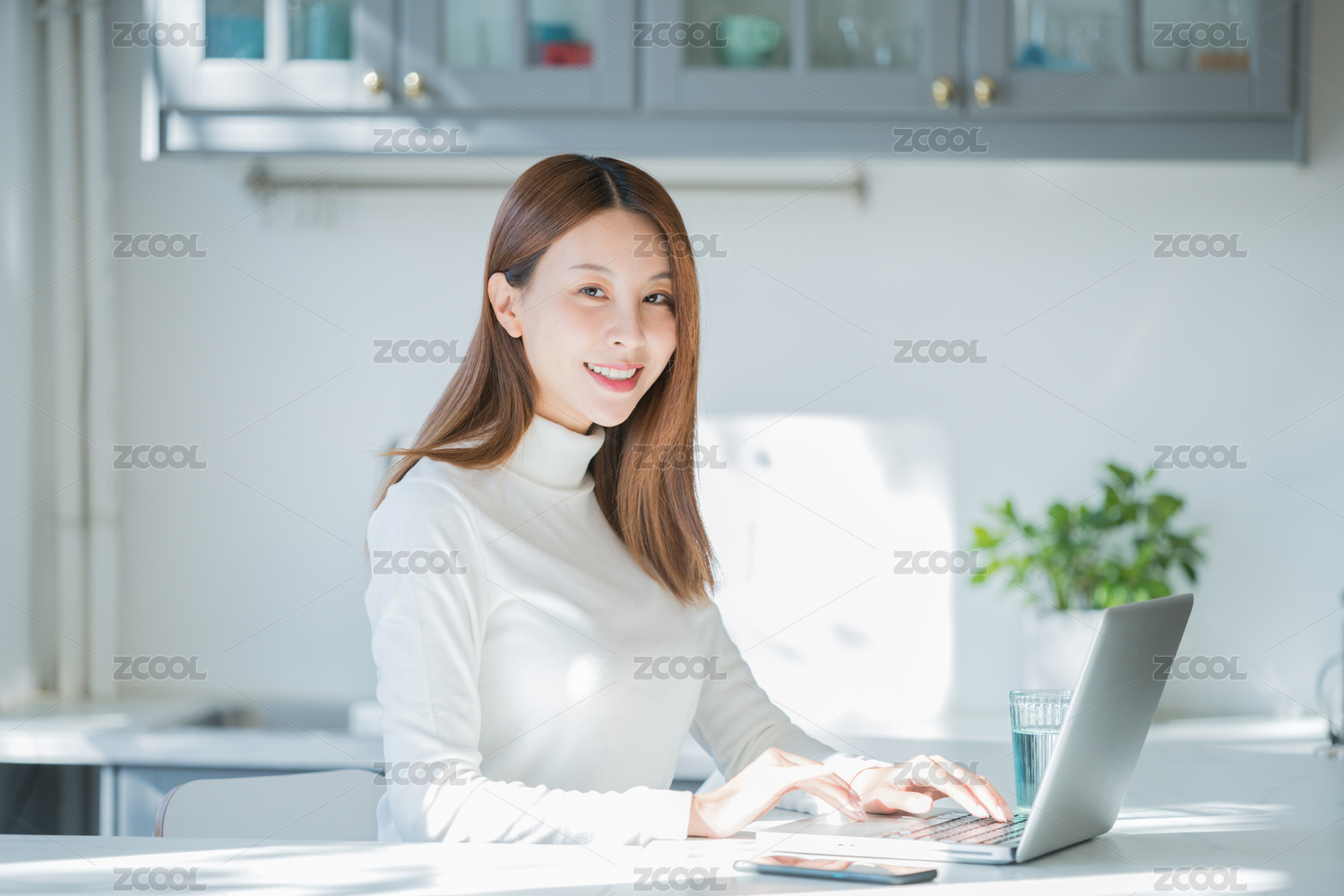 一名年轻女姓在客厅里使用手提电脑进行办公