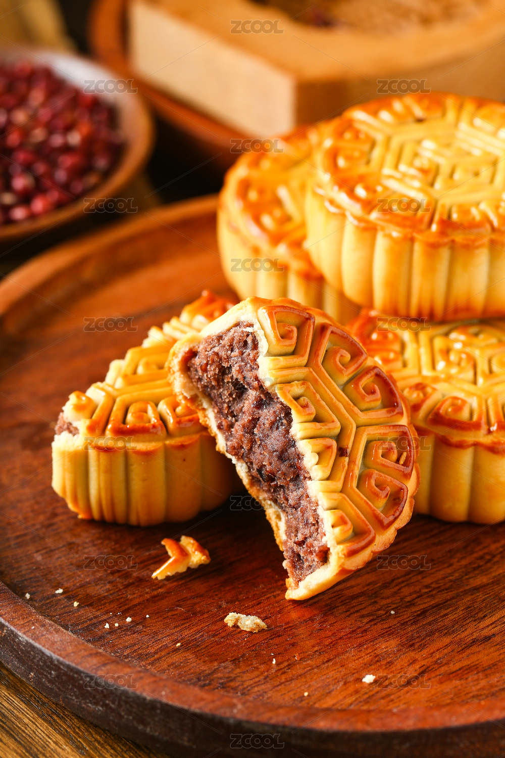 掰开的中秋节红豆豆沙月饼放在棕色木盘子里