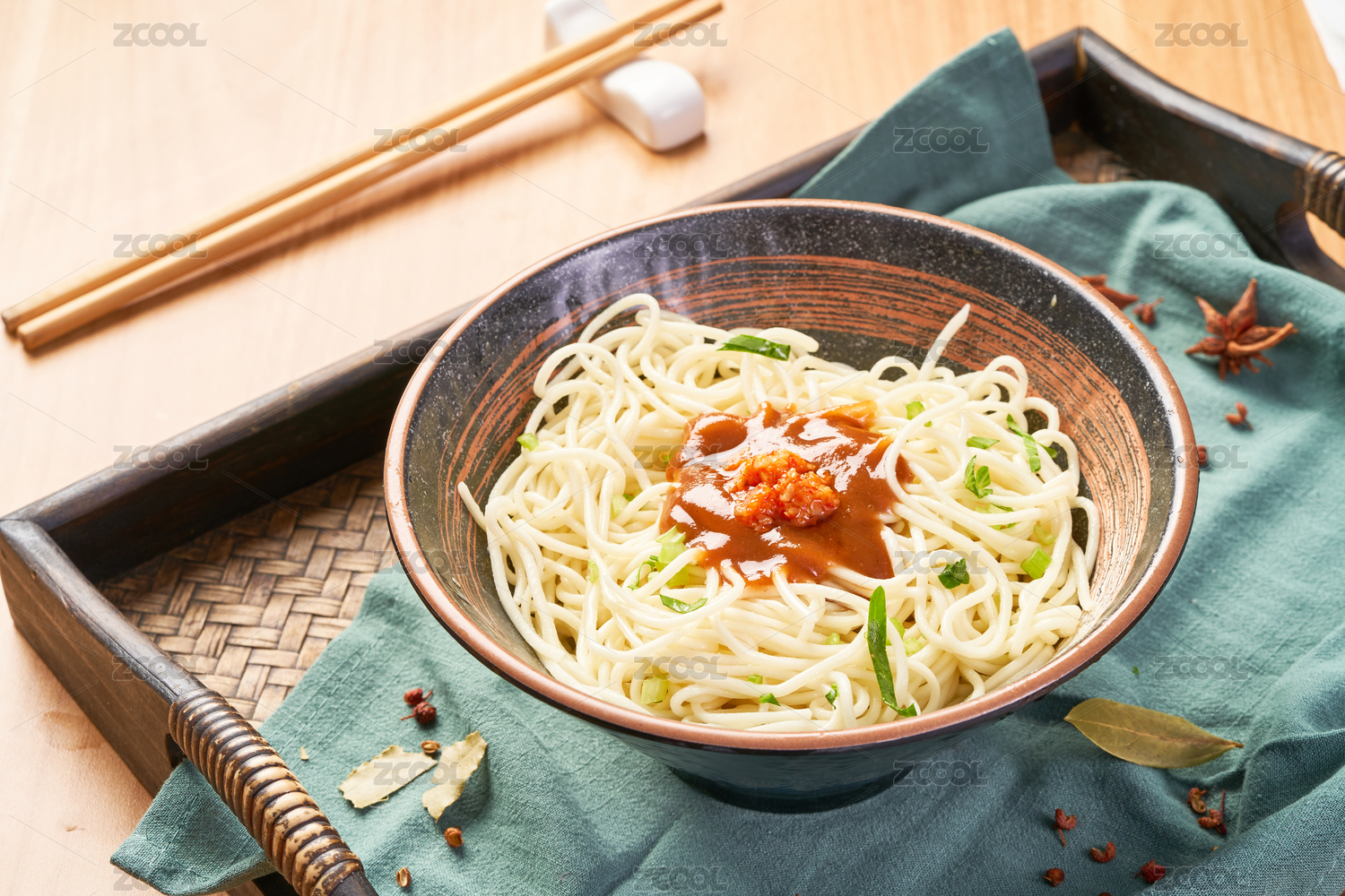 托盘里的一碗杂酱面