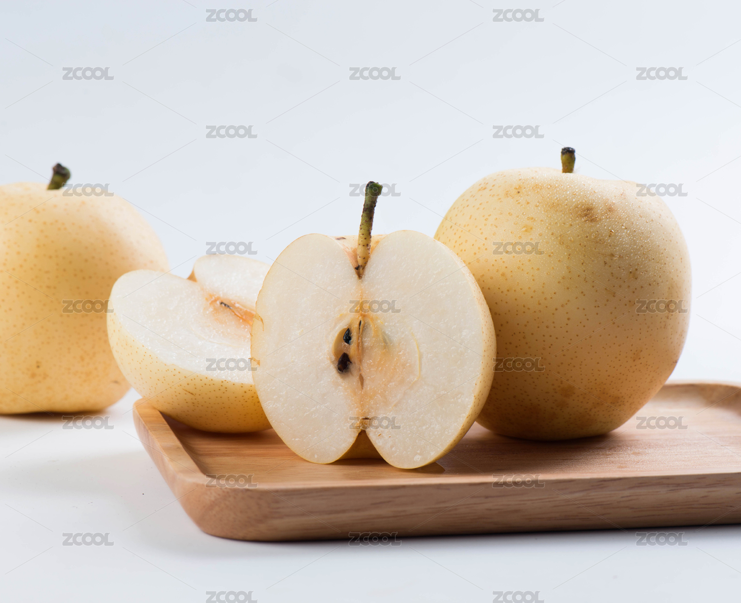 放在白色背景木盘上切开的酥梨