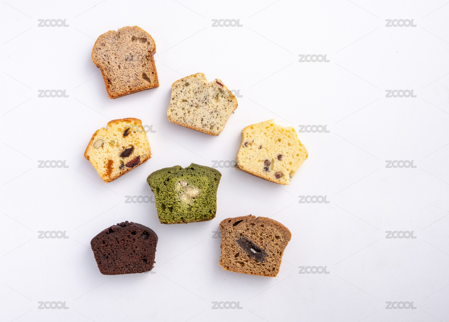 白色背景上的多种口味磅蛋糕