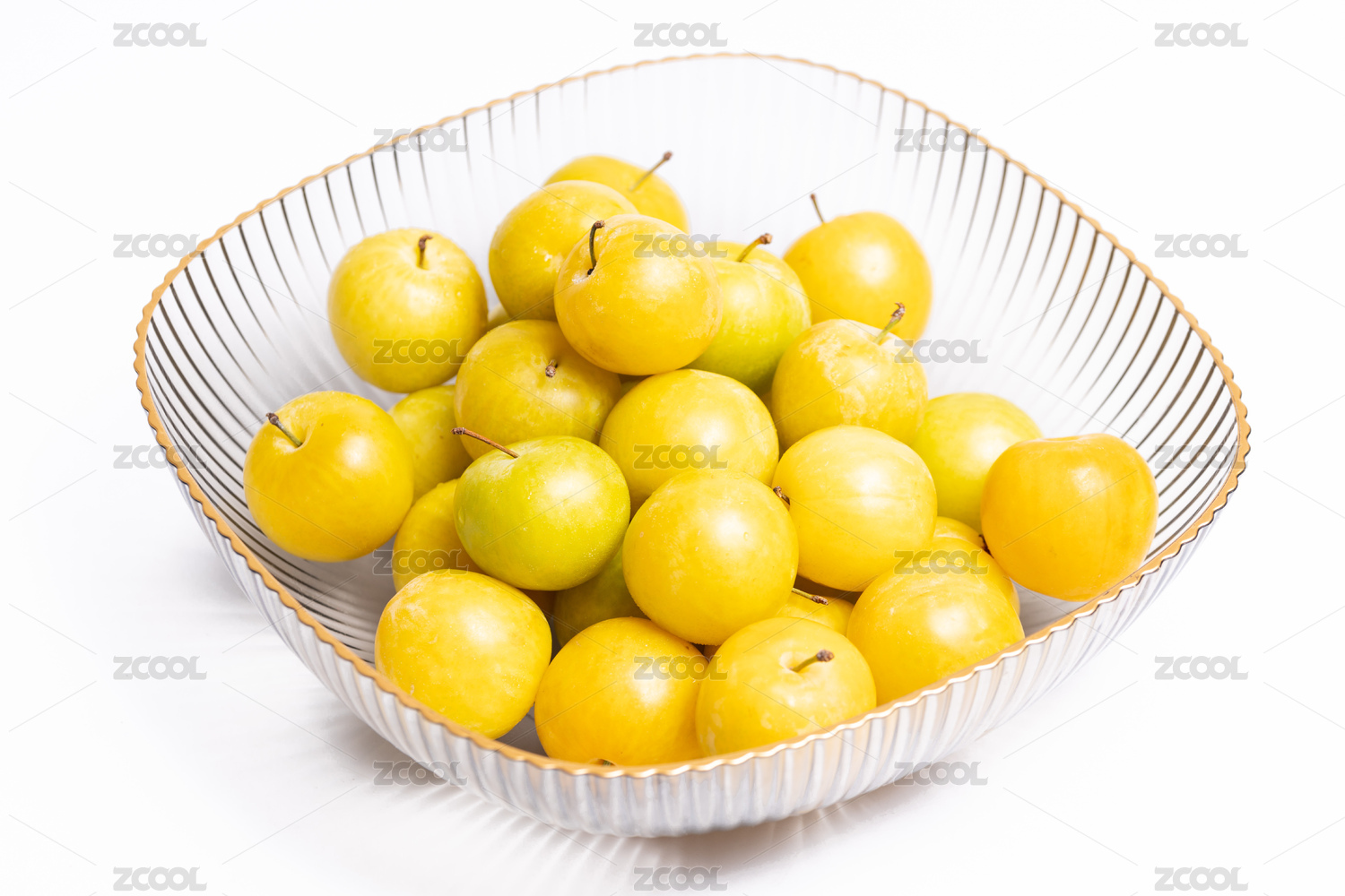 白色背景上玻璃碗里的多个青李子水果