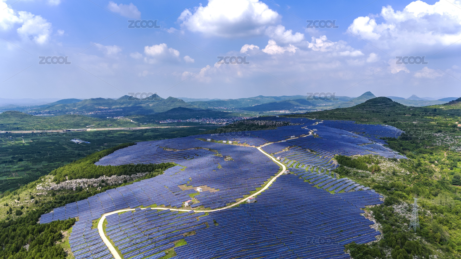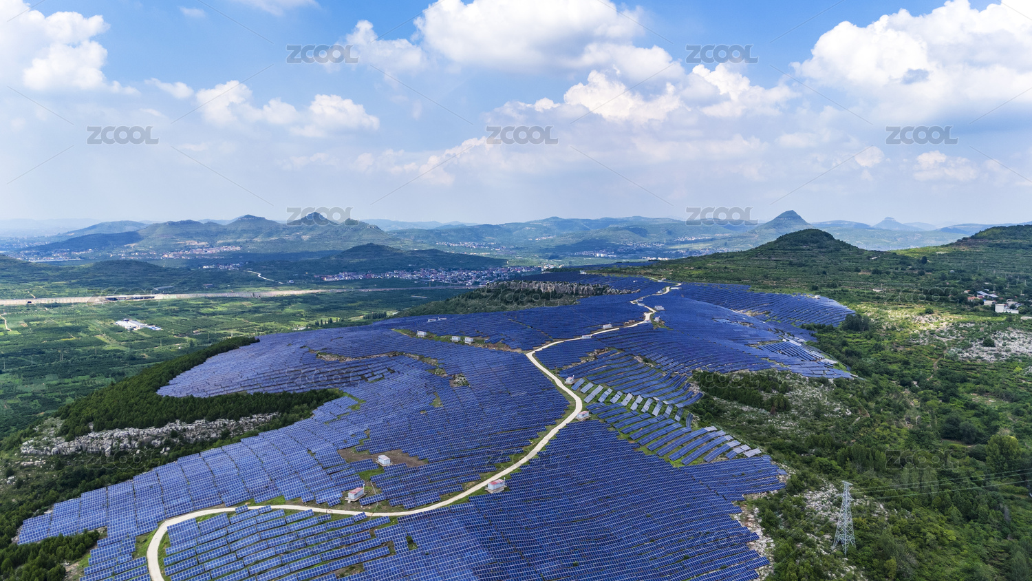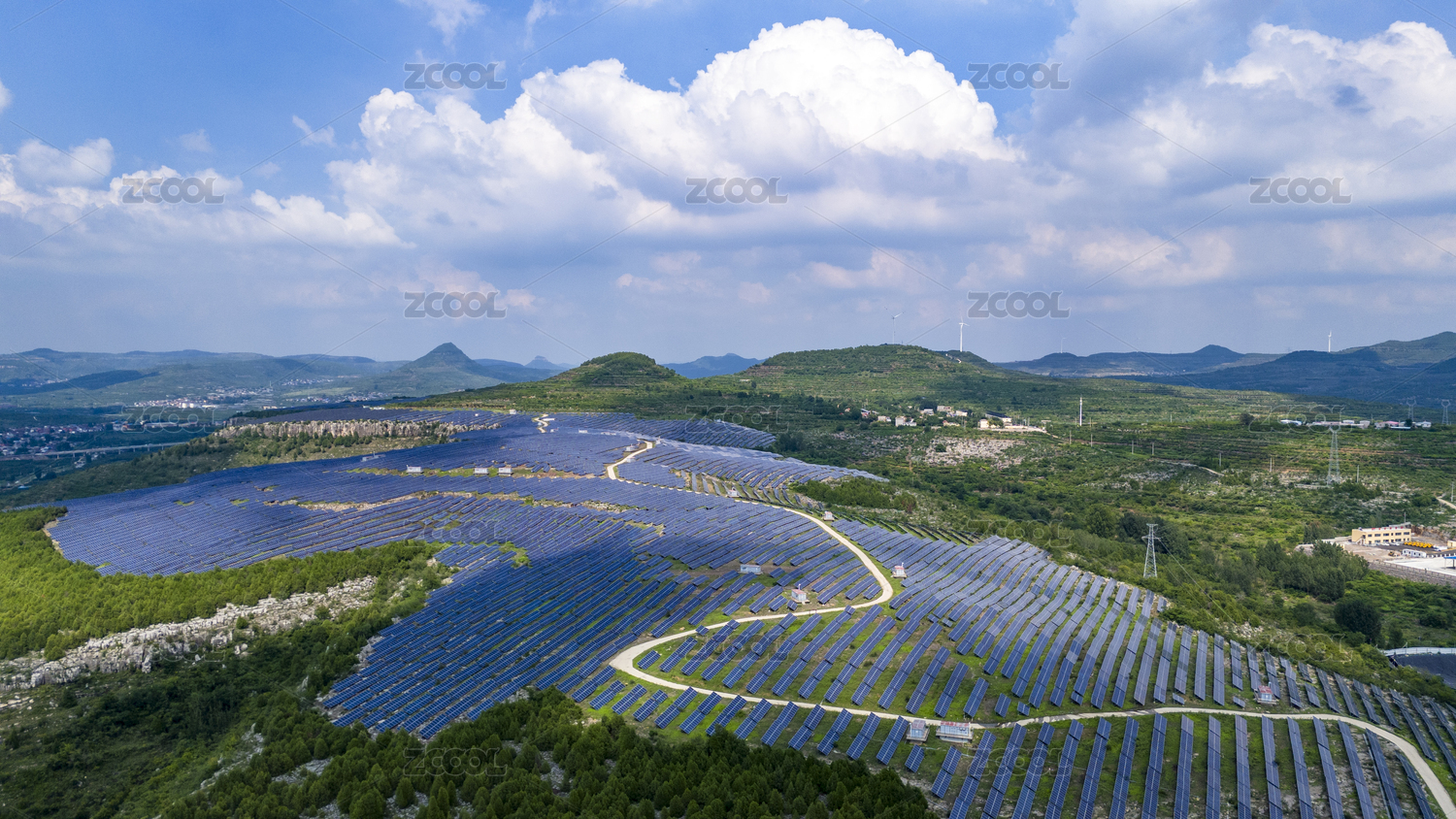 蓝天白云下的山东枣庄山亭区荒山光伏发电站