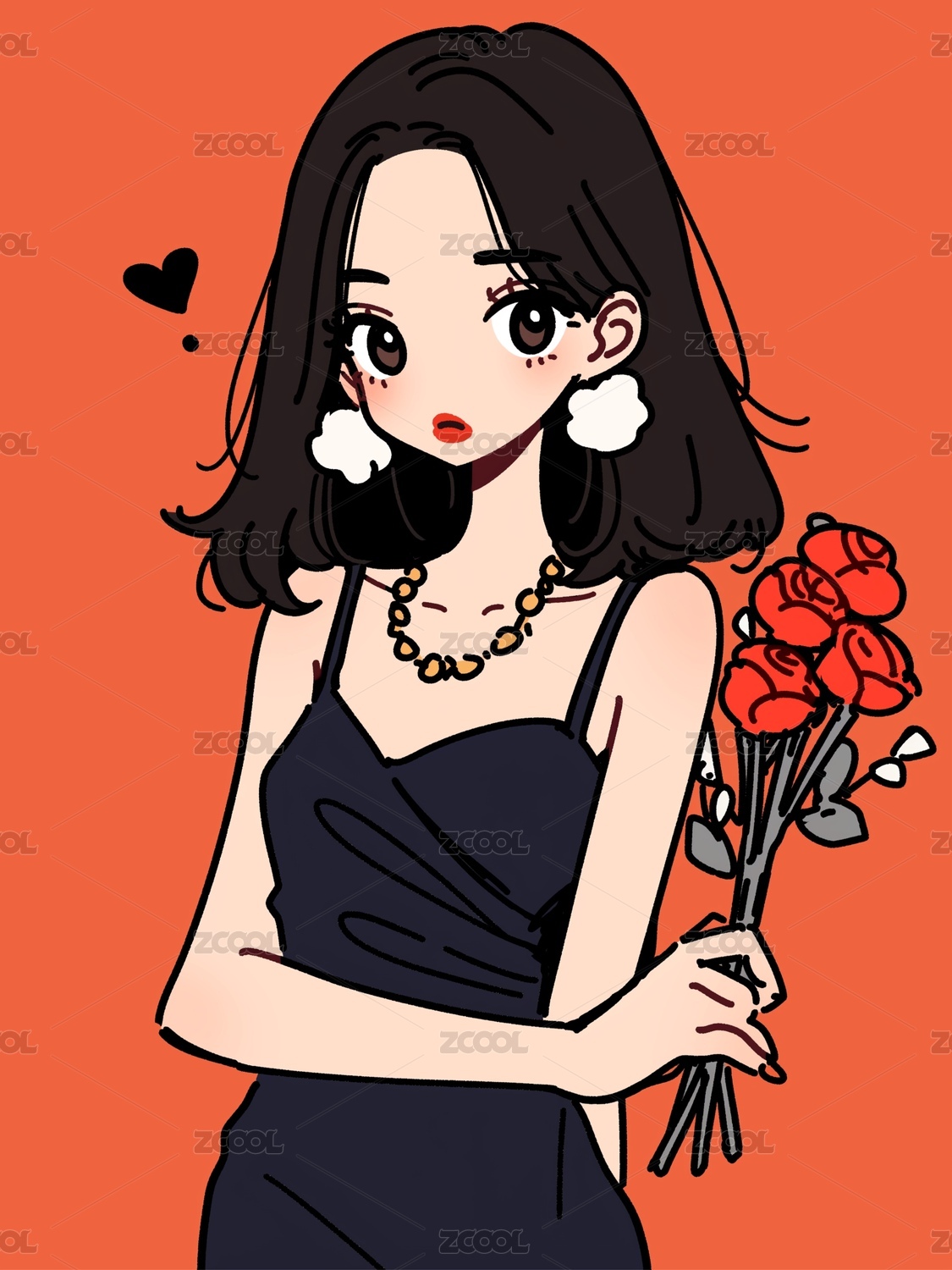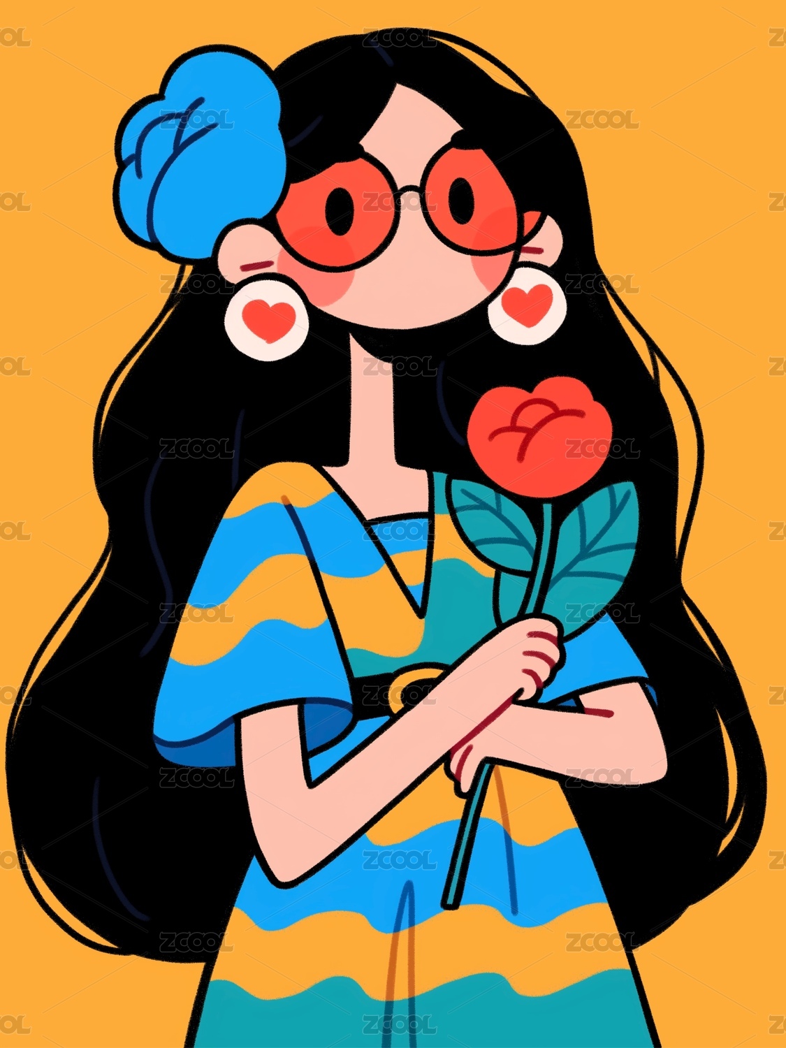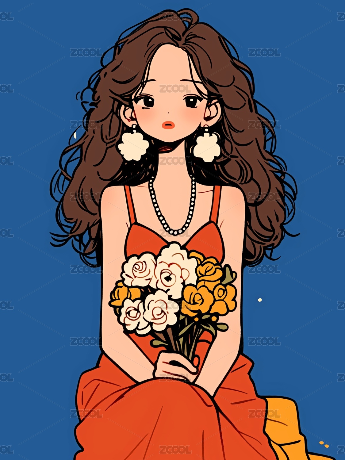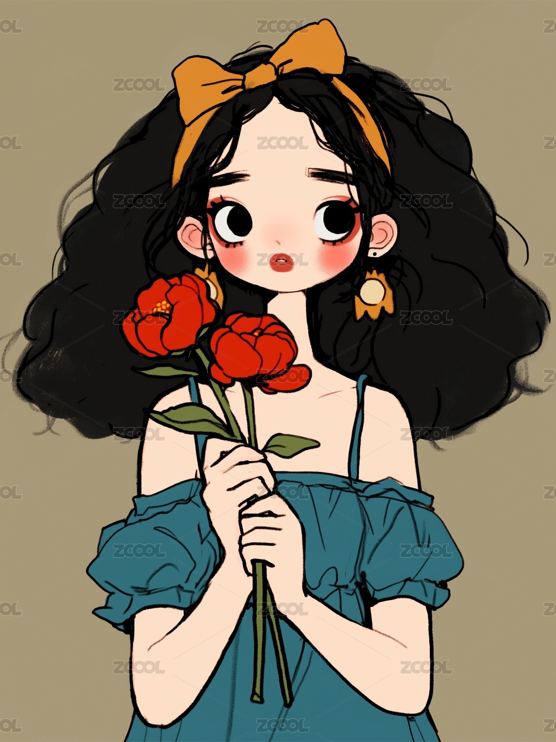 手拿鲜花的少女插画