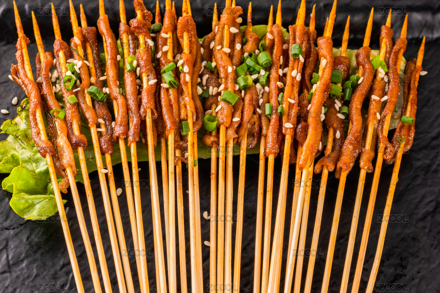 黑色盘里一串串烧烤鸭舌,宵夜档烧烤