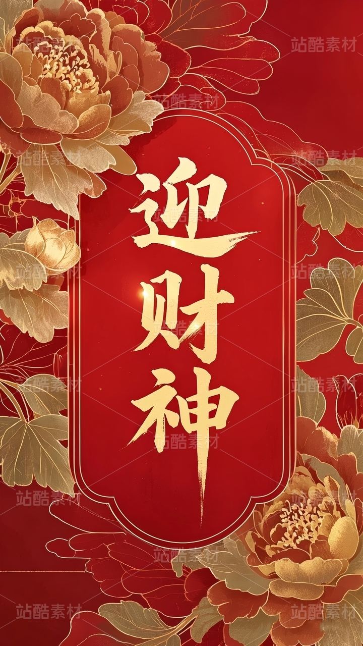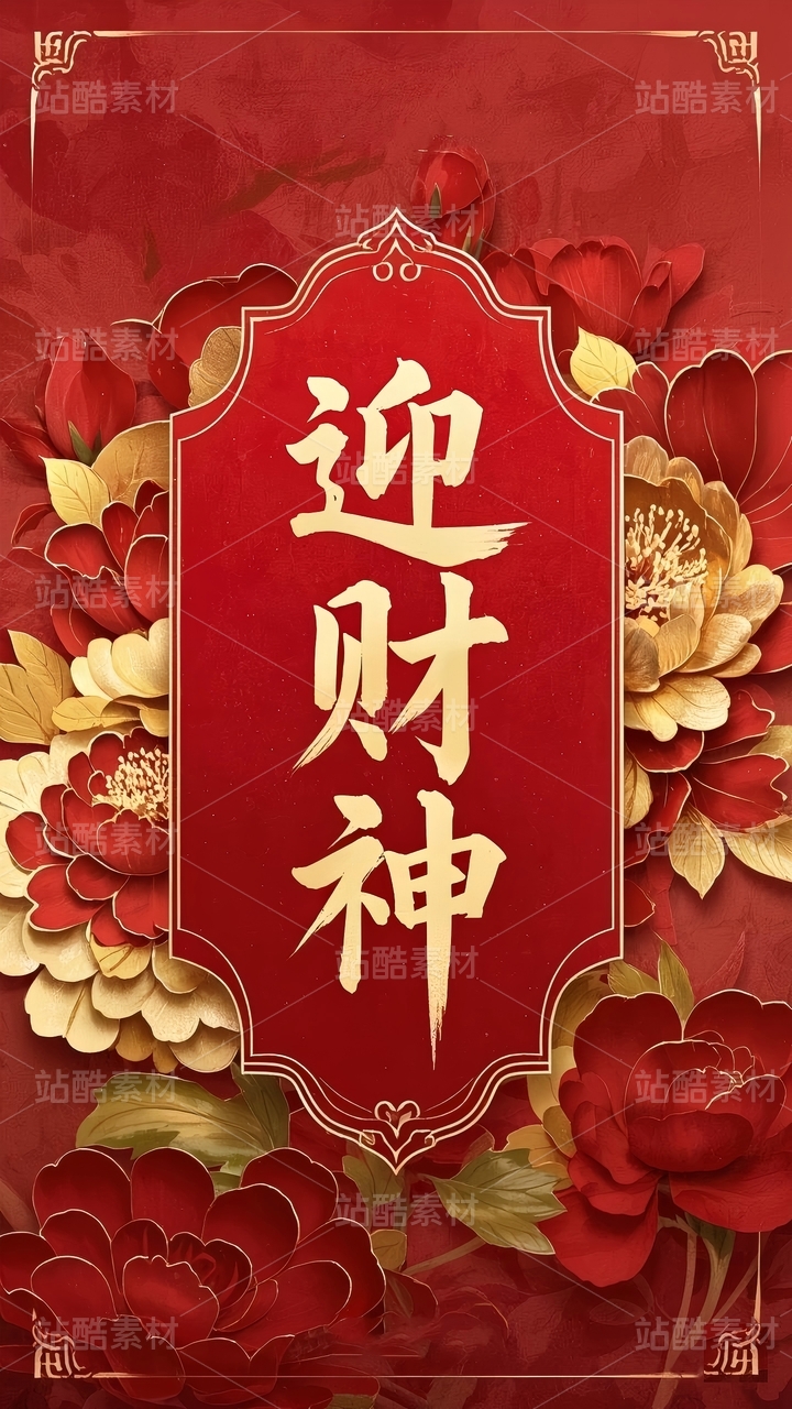 迎财神锦鲤牡丹仙鹤送福开运春节海报
