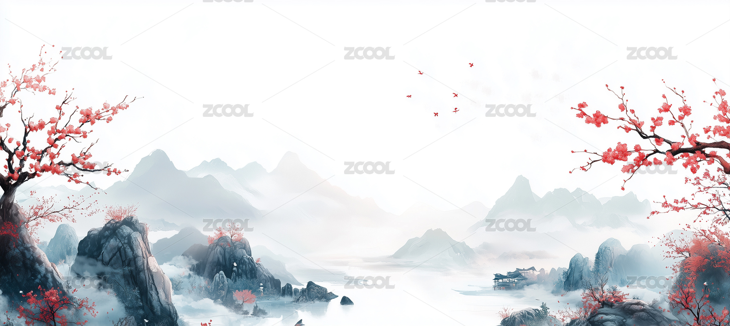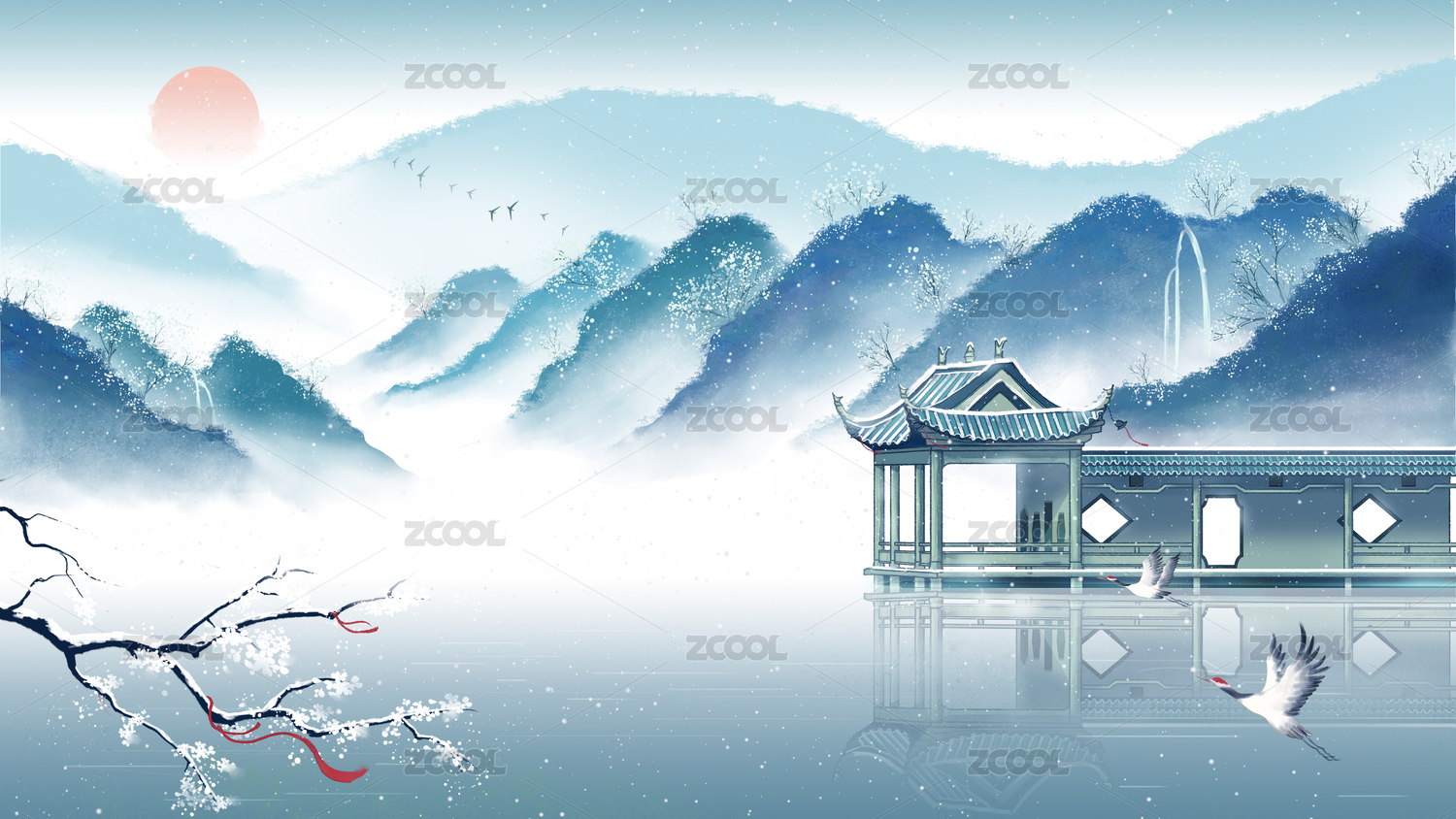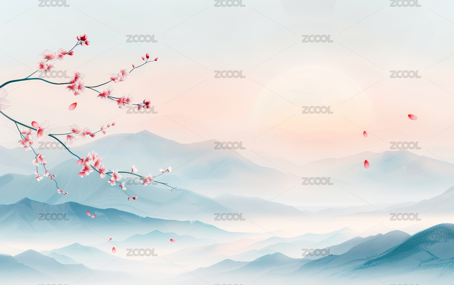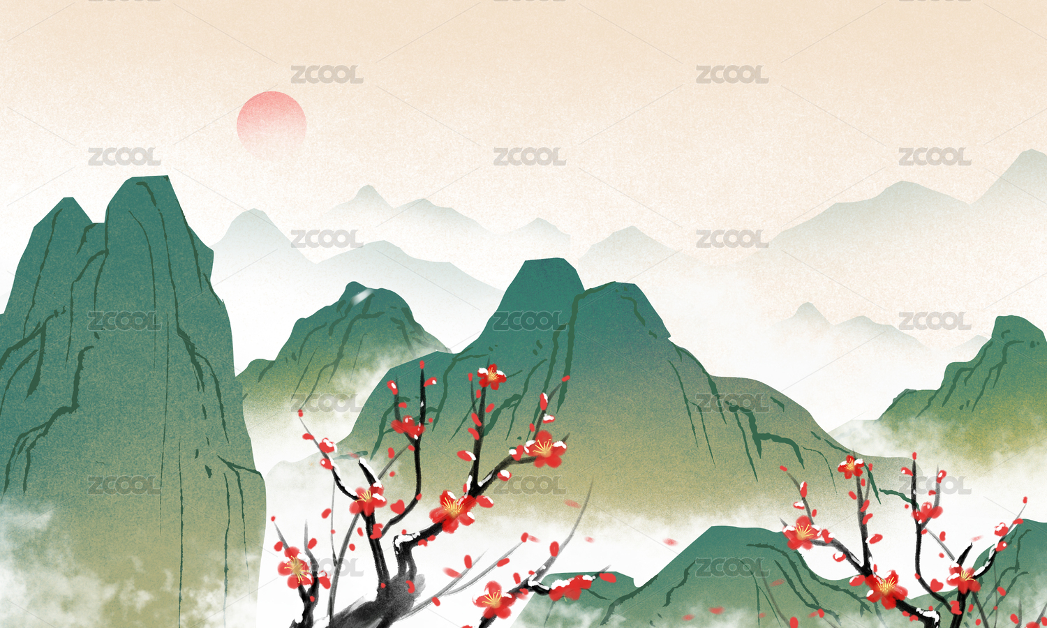 梅花国潮风敦煌壁画中国风诗意江风景插画