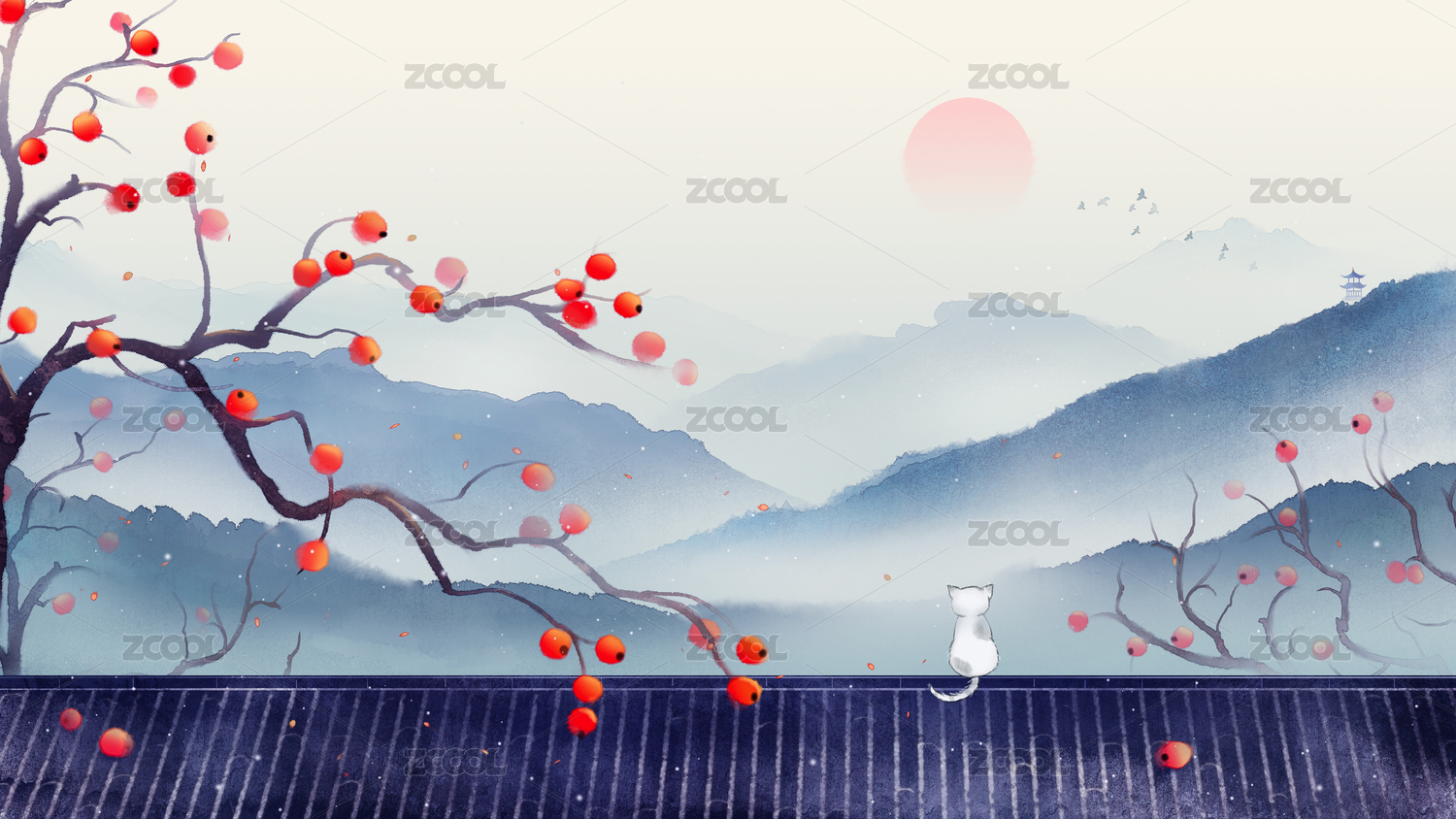秋天,秋季,霜降,节气,季节,柿子,树枝,中国画,水墨画,中国风