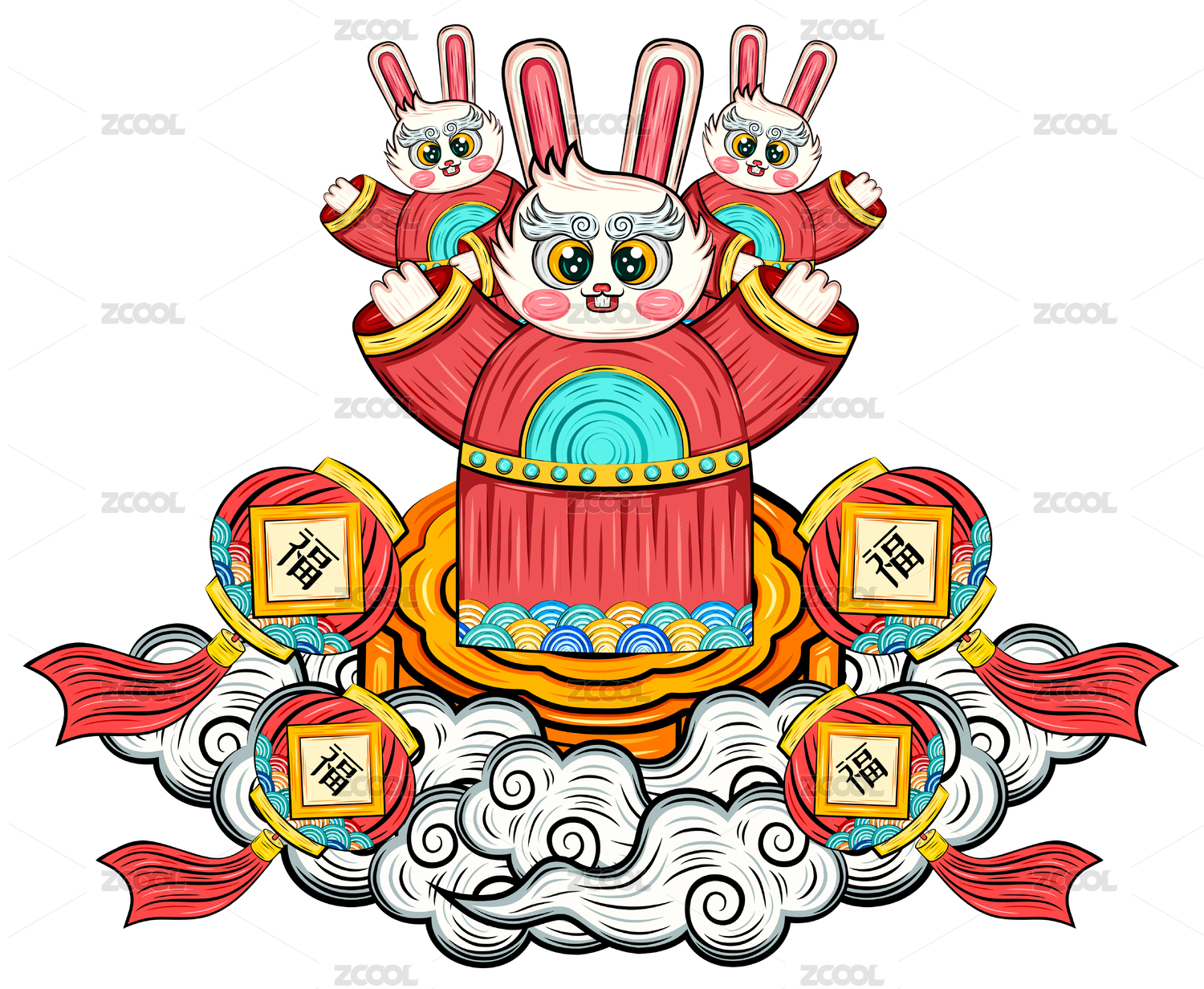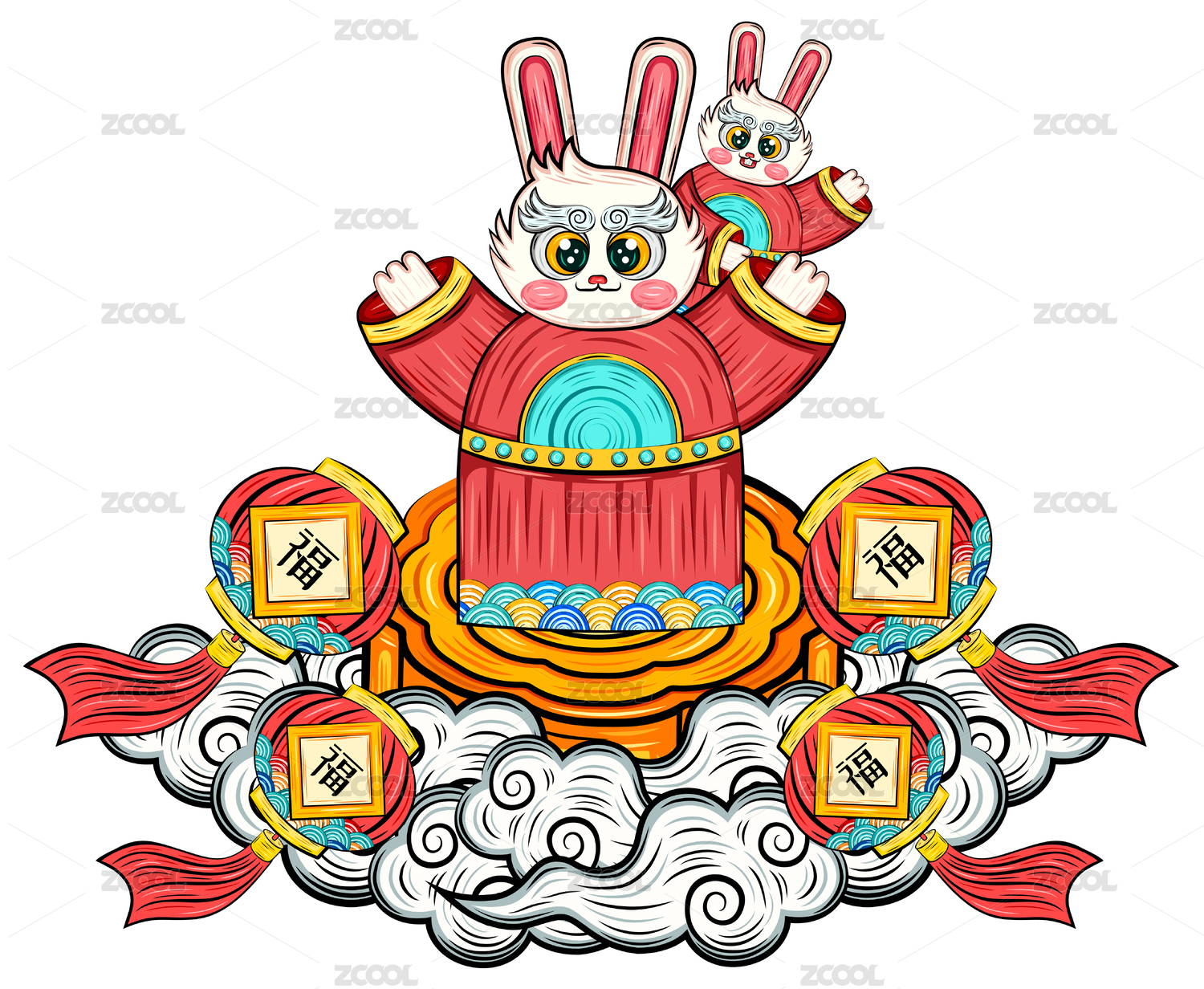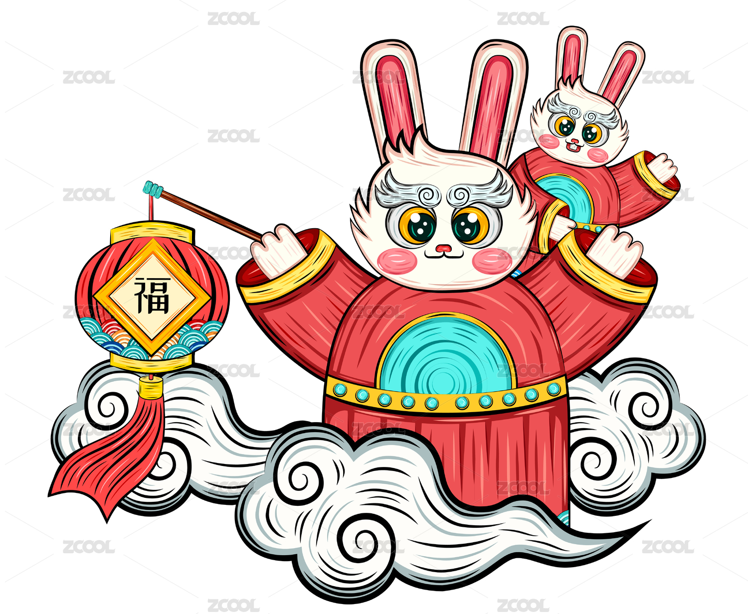 国潮兔年祥云春节玉兔灯笼吉祥送福矢量插画