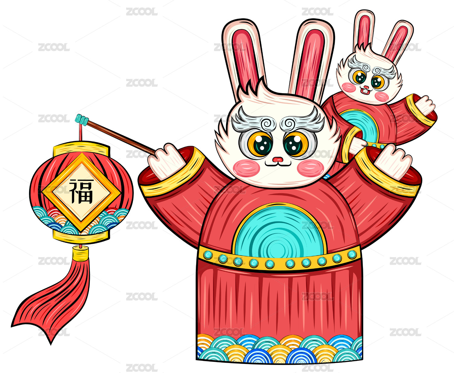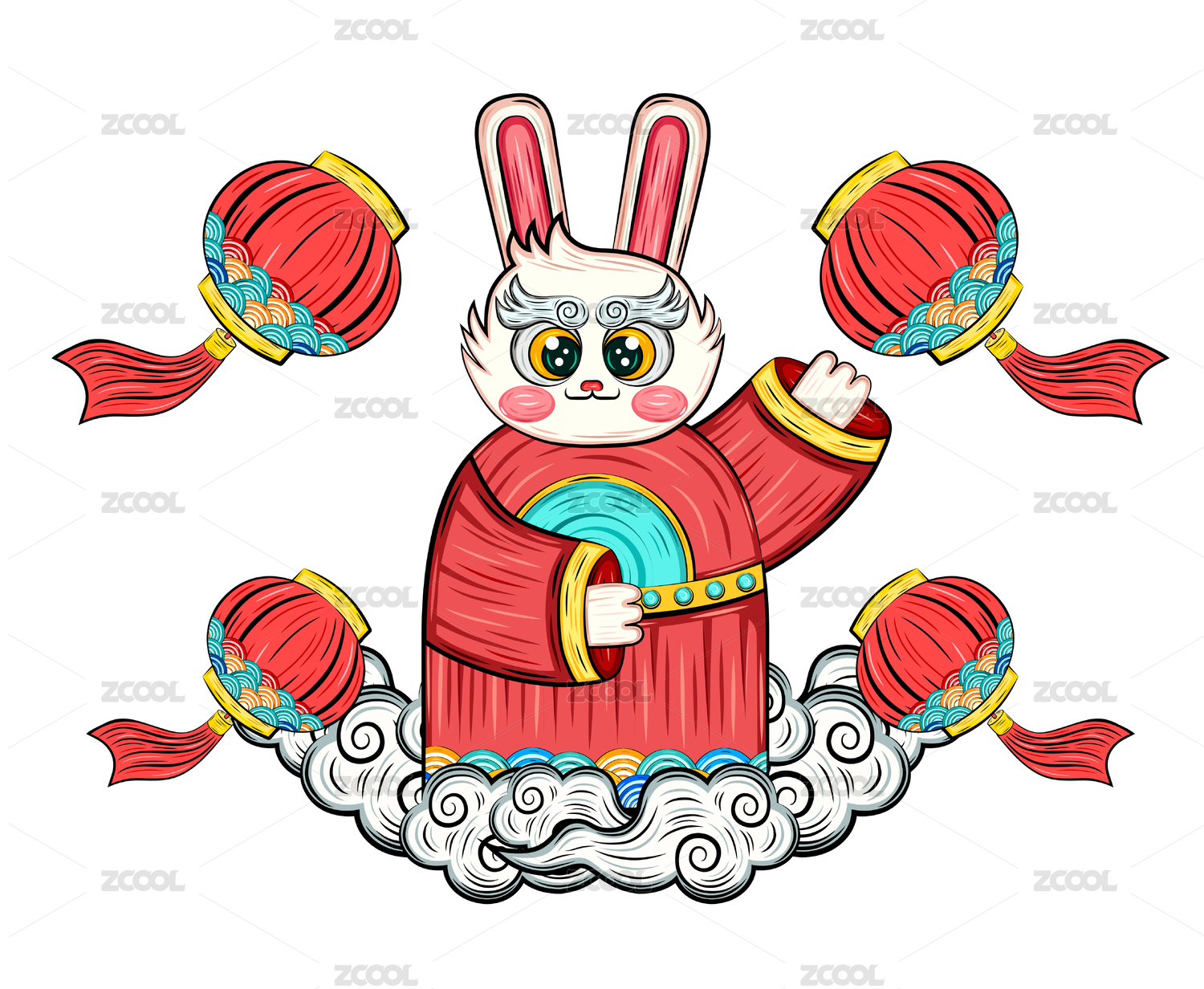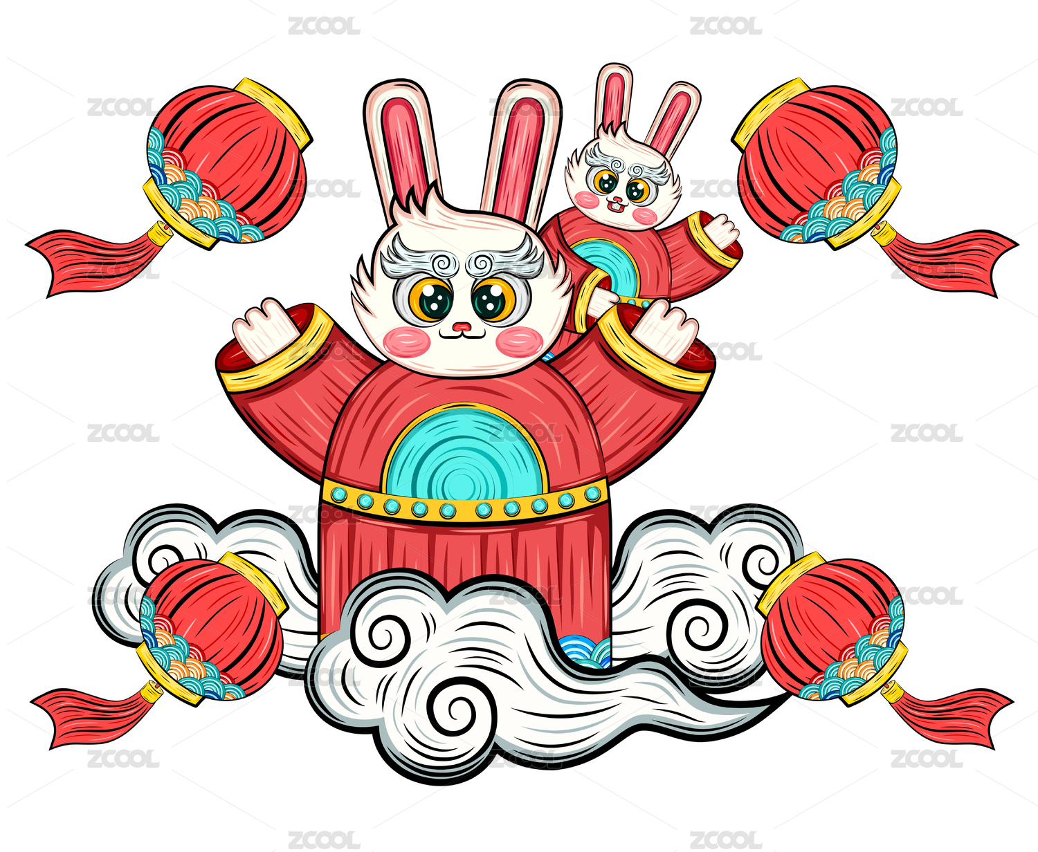 国潮兔年祥云玉兔灯笼春节庆贺矢量插画素材