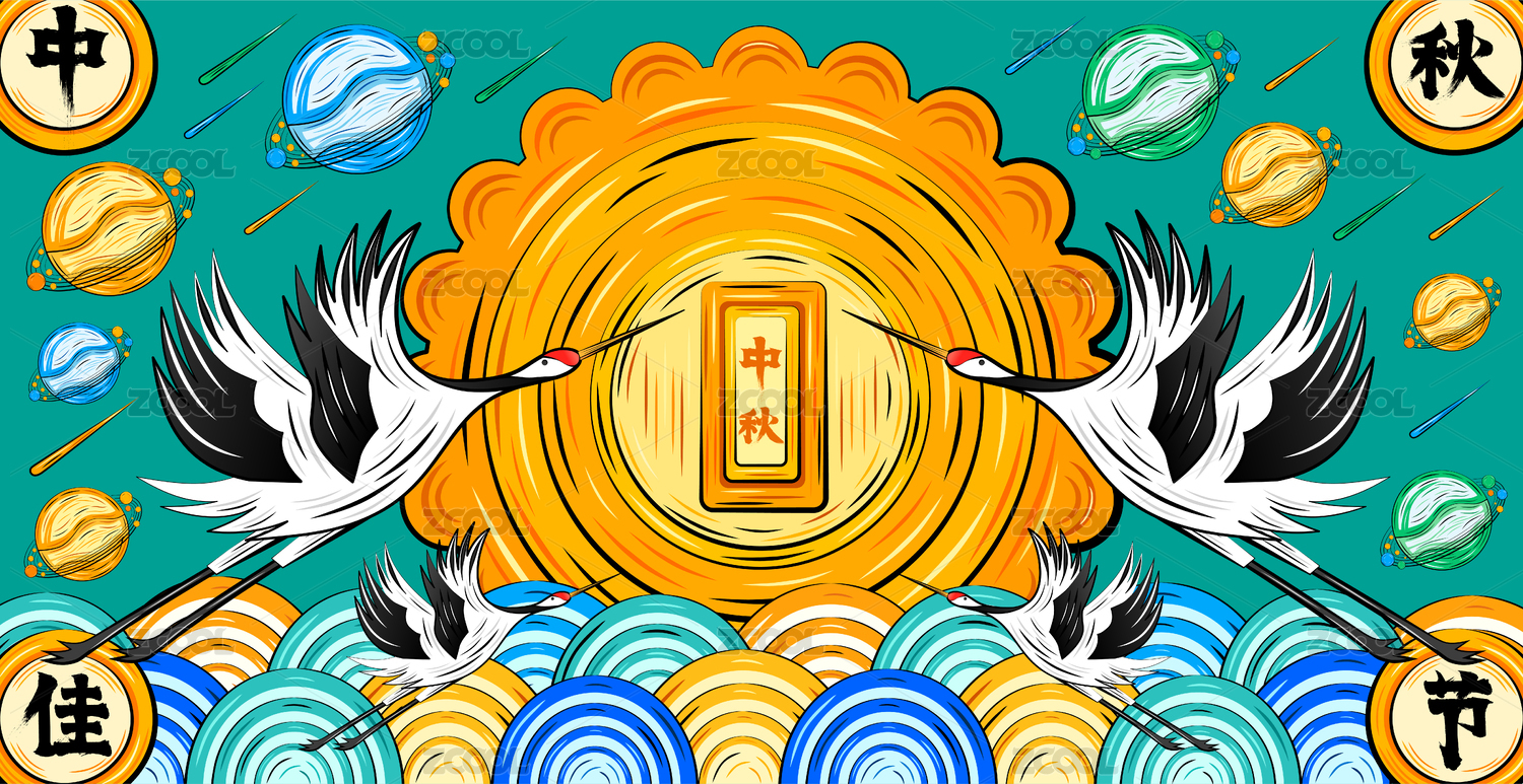 国潮月圆中秋仙鹤热闹欢庆吉祥送福矢量插画