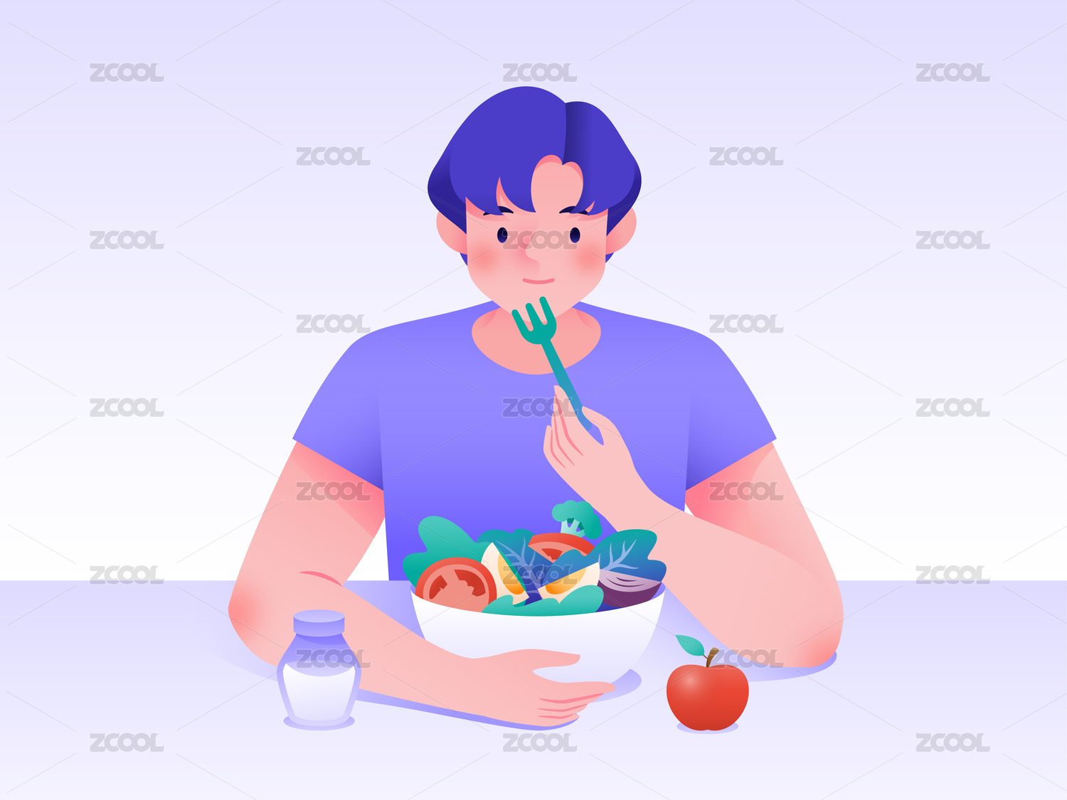 一个男生、吃蔬菜水果沙拉减肥餐矢量插画