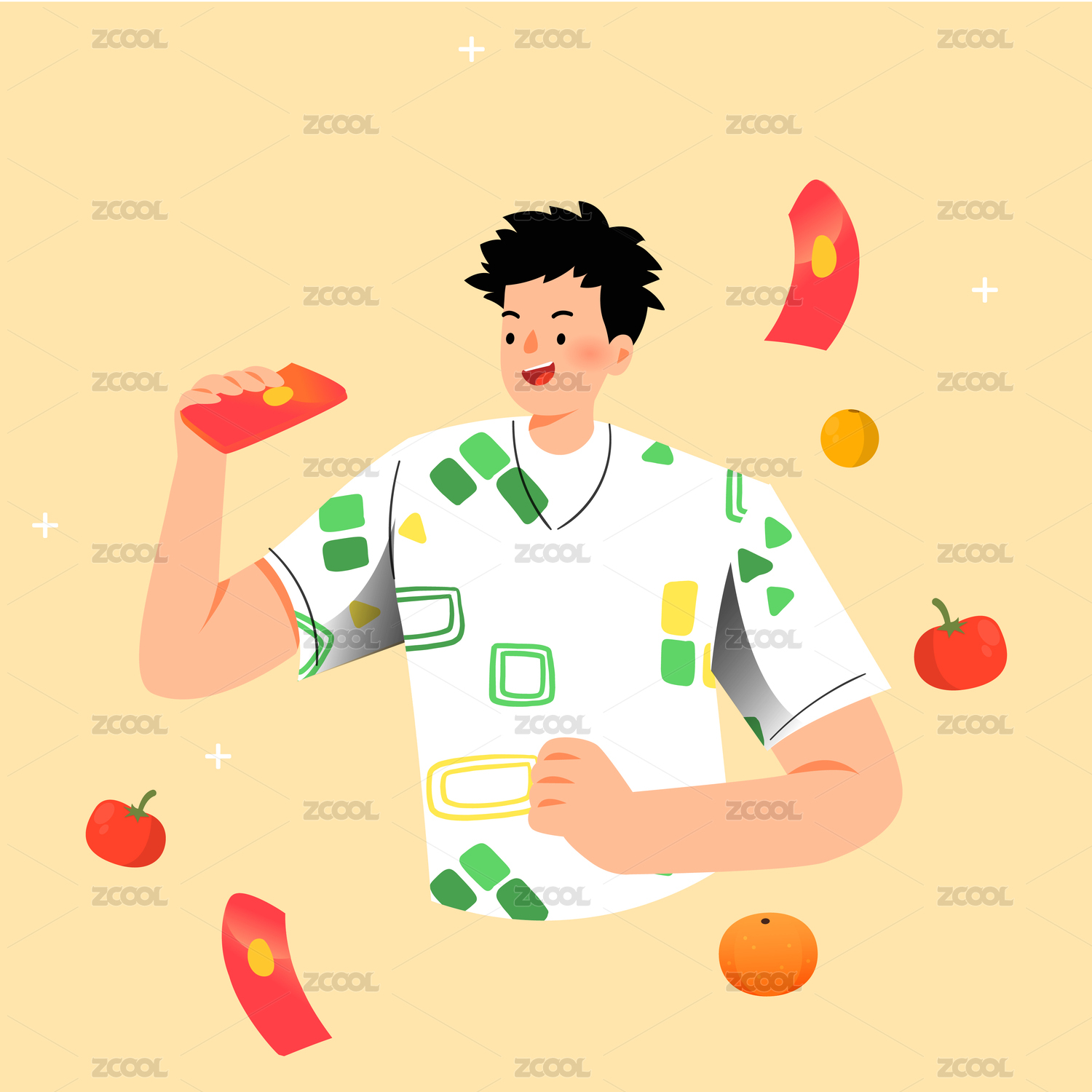 一个男生对着餐桌上的营养食物欢呼矢量插画
